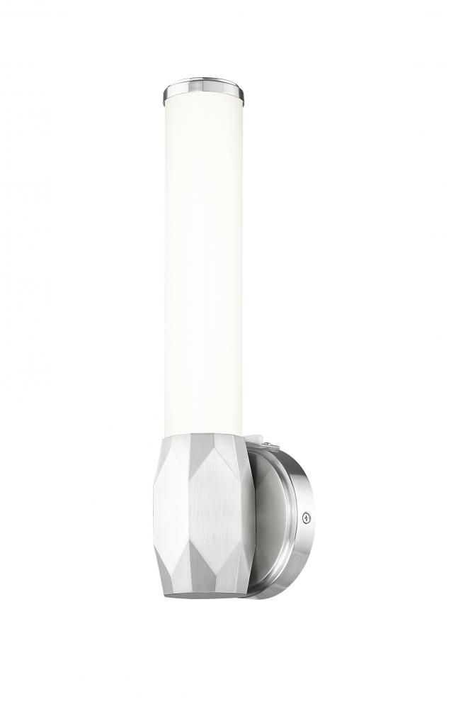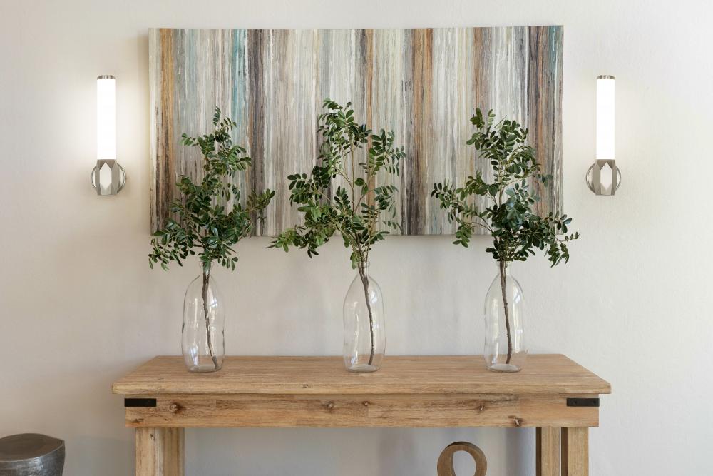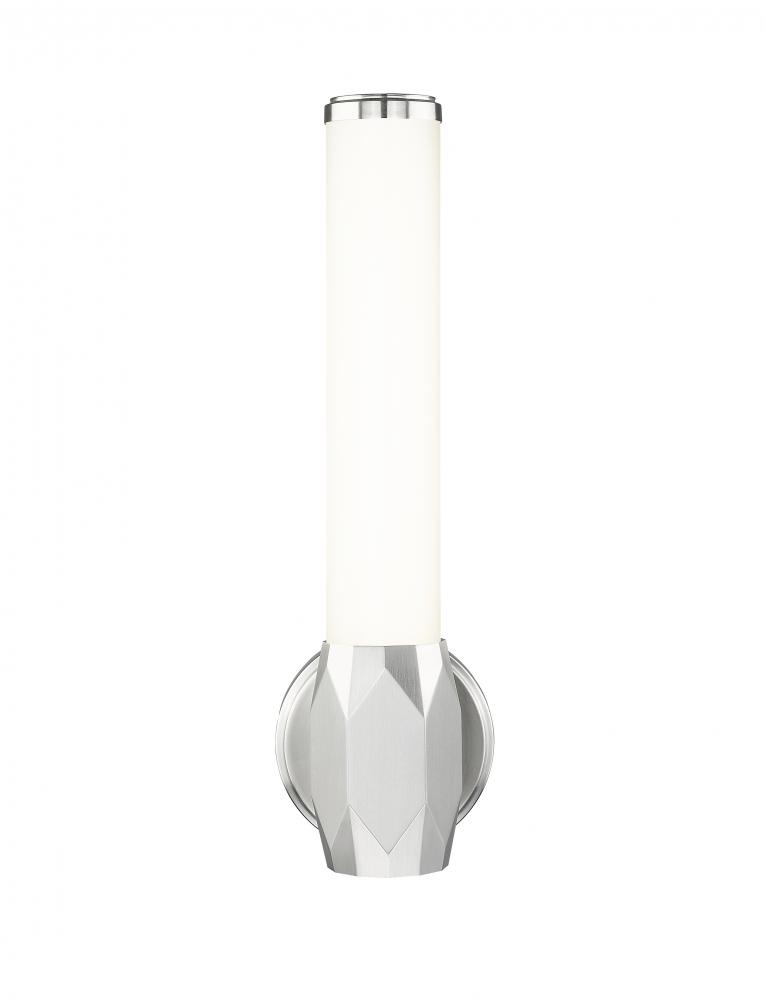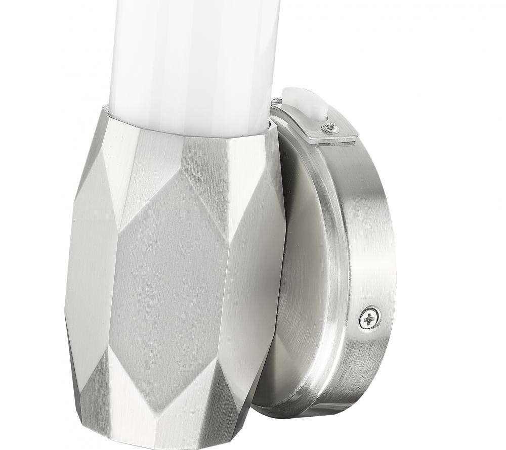 Dimming features and color light value selections add a host of modern technology to this one-light wall sconce. With a brushed nickel finish aluminum frame including diffuser end caps and a prism-inspired center holder, its Art Deco influence shows through to soften any living space.