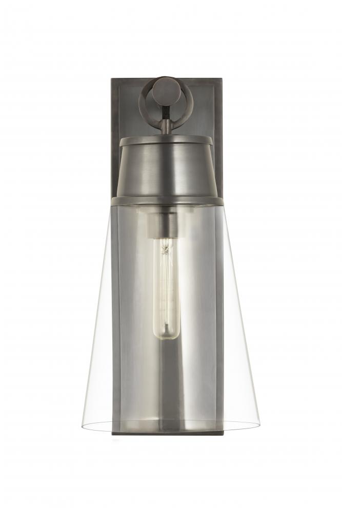 Indulgent sophisticated design elements create a classic modern look in the Wentworth wall sconce, a superb choice for updating contemporary spaces with chic sparkle. Its conical shade made of clear glass suspends with a charming loop ring and mounts to a sleek, slender wall plate, all metal elements reflecting a cool plated bronze finish. This wall light borrows a page from romantic nautical aesthetics.