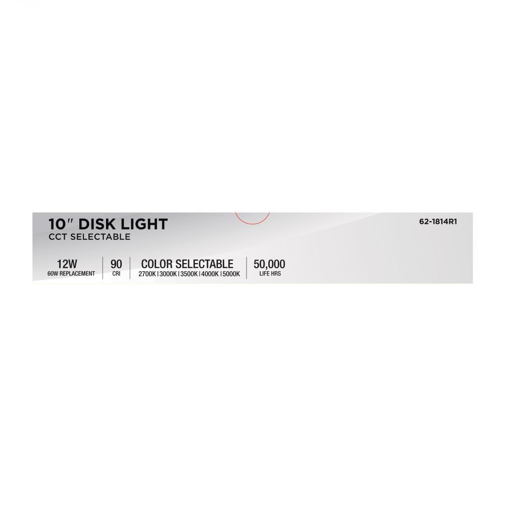 Designed for larger spaces, SATCO NUVO's 62-1814R1, 10" CCT Selectable Disk Light in a black finish delivers powerful, customizable illumination with a sleek, low-profile look. Consuming just 12 watts, this high-performance fixture features five se