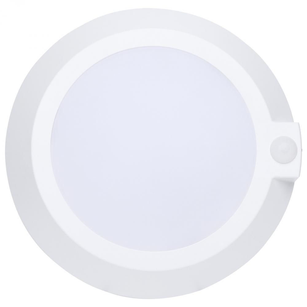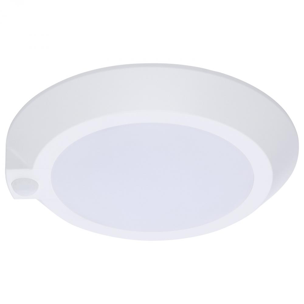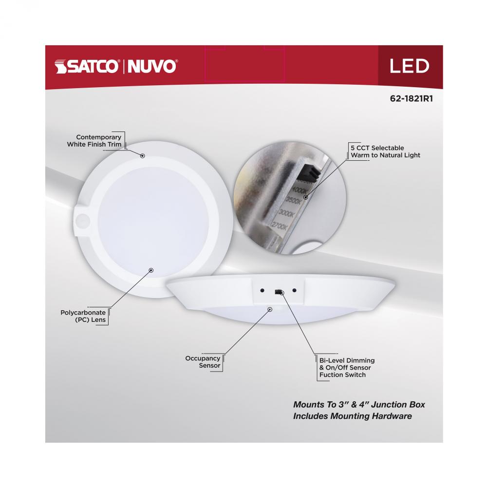 SATCO NUVO's 10-inch white CCT Selectable Disk Light, #62-1821R1, offers efficient, modern lighting in a larger format. Featuring five selectable color temperatures (2700K/3000K/3500K/4000K/5000K), it easily meets diverse lighting needs across various