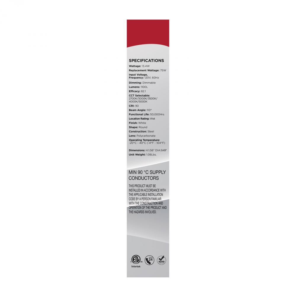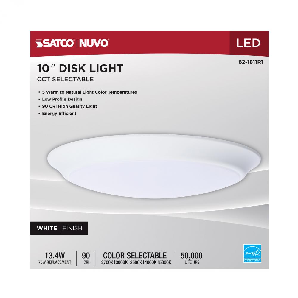 Designed for larger spaces, SATCO NUVO's 62-1811R1, 10" CCT Selectable Disk Light in a white finish delivers powerful, customizable illumination with a sleek, low-profile look. Consuming just 13.4 watts, this high-performance fixture features five