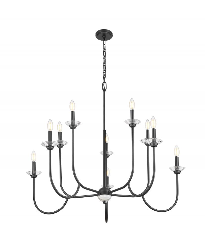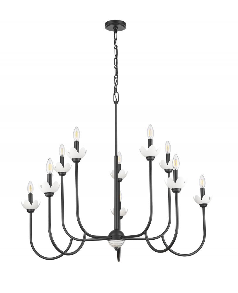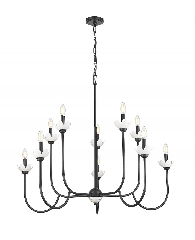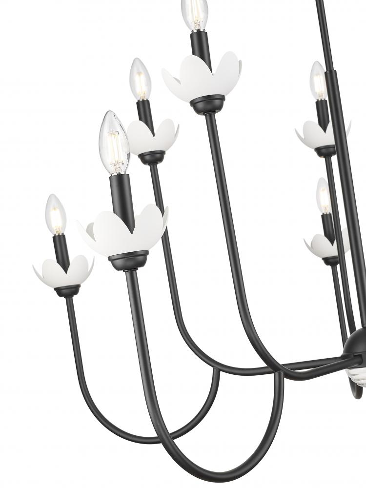 Bring feminine, mid-century inspired energy to an entry, bedroom, or living area with this striking 10-light chandelier. Interchangeable bobeches allow you to freshen up the look as the seasons change, while floral details add organic flair and plenty of charm. A matte black finish graces its elegant steel frame, maximizing contrast and depth.