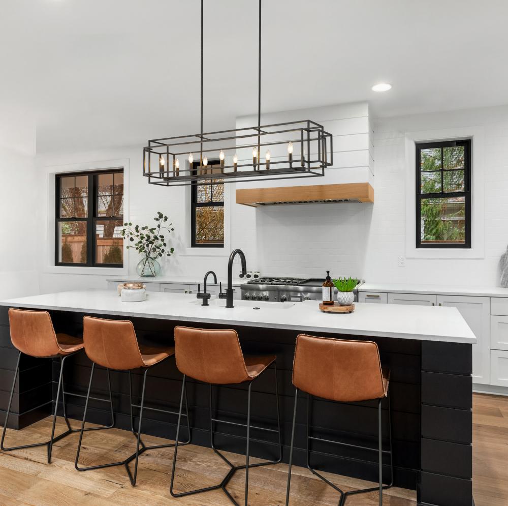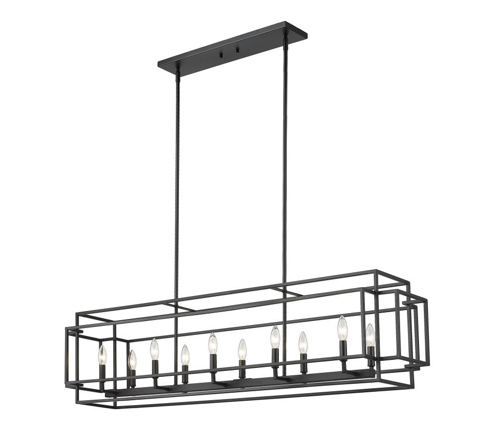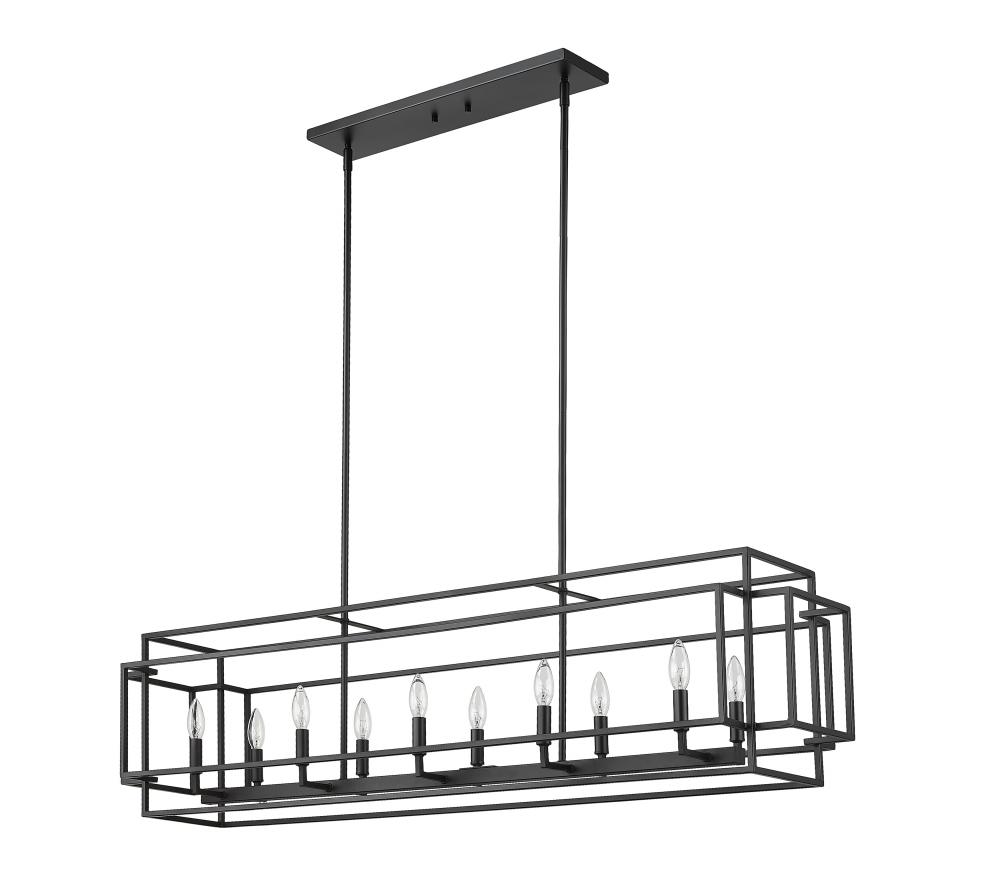 Create a modern architectural feel to kitchen islands, countertops and more with this grand linear ten-light island pendant, featuring an oversized and elongated open and airy slim steel cage in a dramatic matte black finish. Frank Lloyd Wright-inspired influences carry through in its elongated horizontal frame, offering a minimalist industrial aesthetic that showcases a row of ten candelabras that project a lovely illumination across tablescapes. Dual suspension rods mirror the slender wire-like cage and offer additional security.