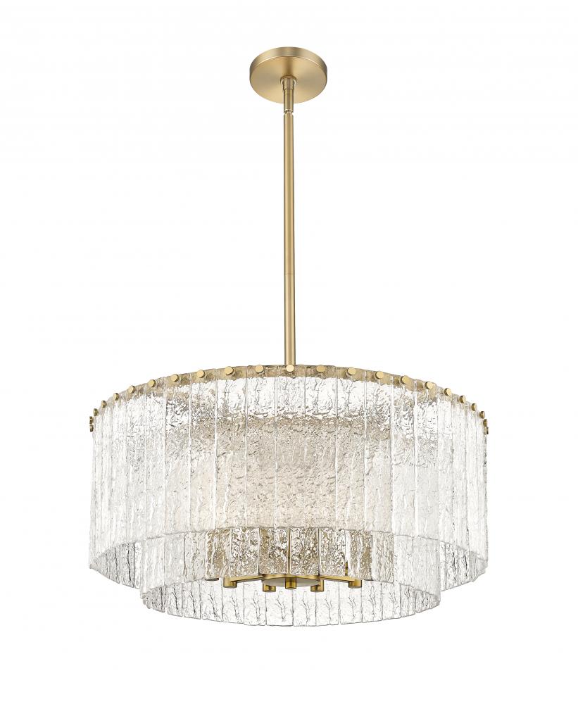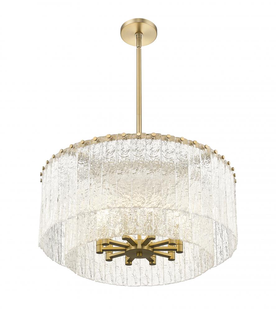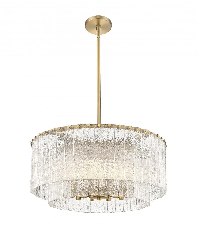 Modern gold finishing adds welcoming warmth and sophistication to this contemporary 10-light pendant. A sparkling centerpiece, it boasts a round, two-tiered silhouette that casts rich, diffused illumination through icy textured glass panels. Its a dynamic addition over a dining table, in your inviting foyer, or as the finishing touch in a sophisticated bedroom.