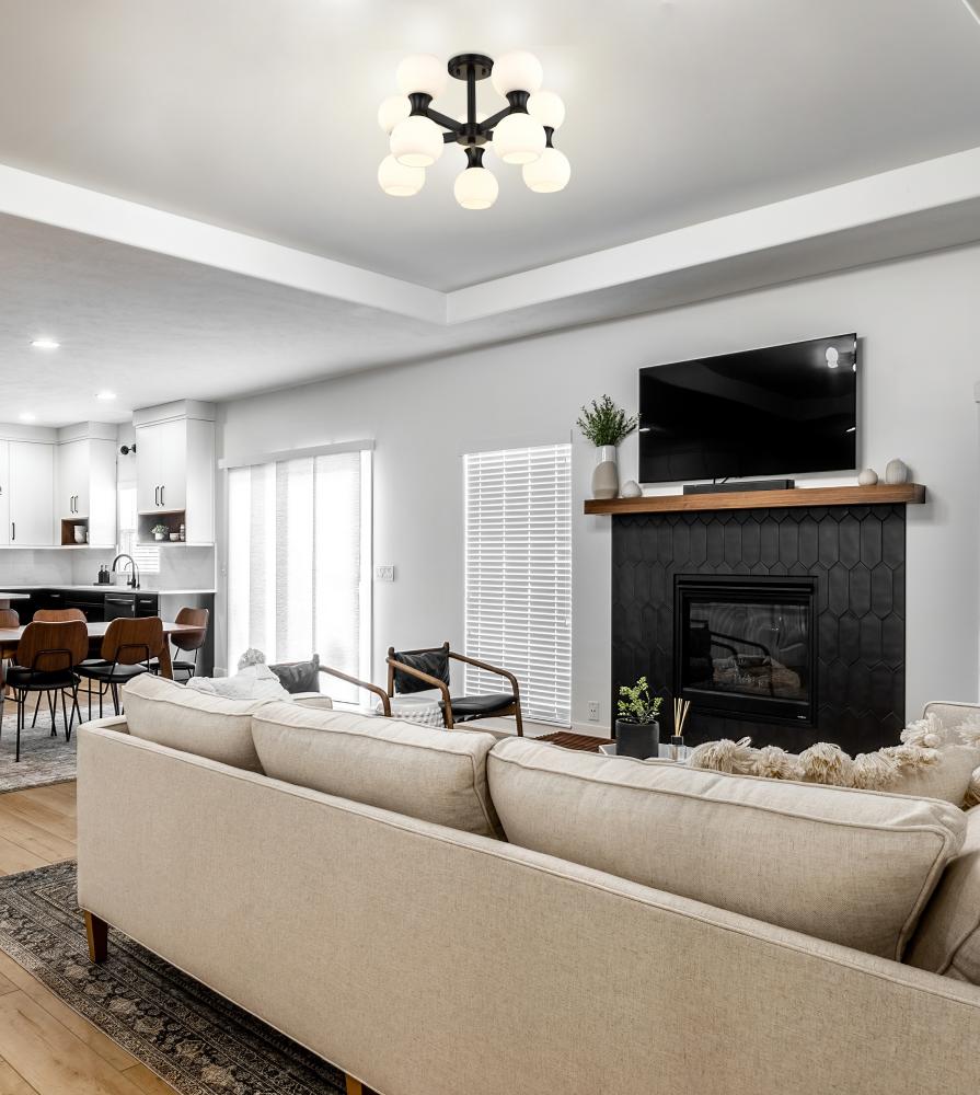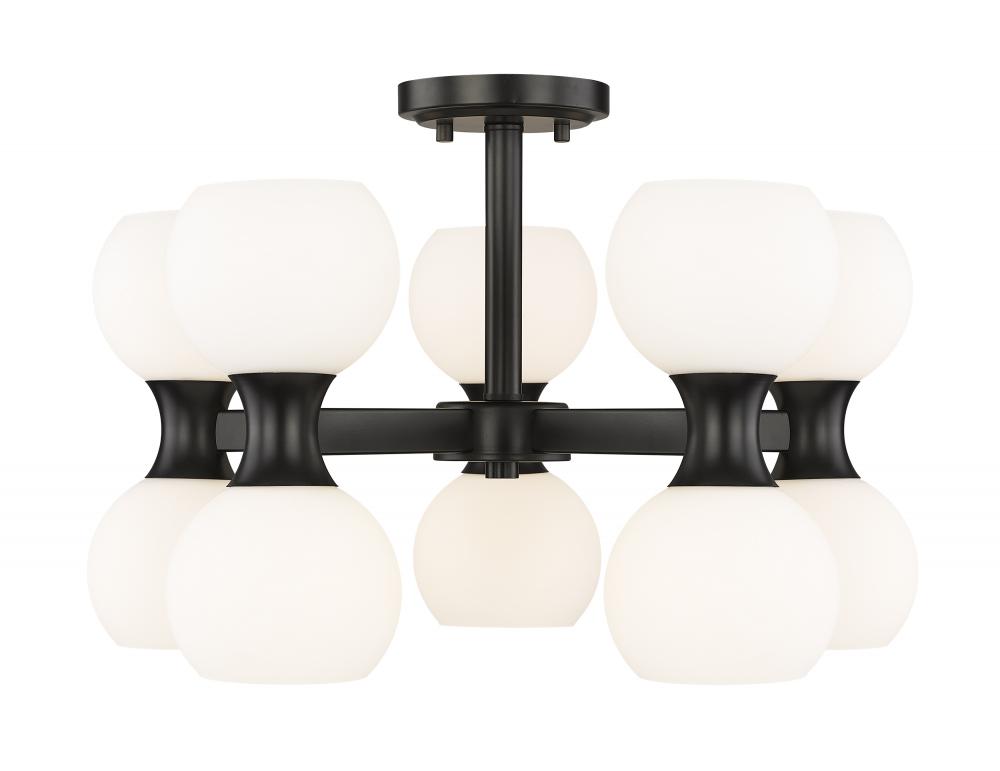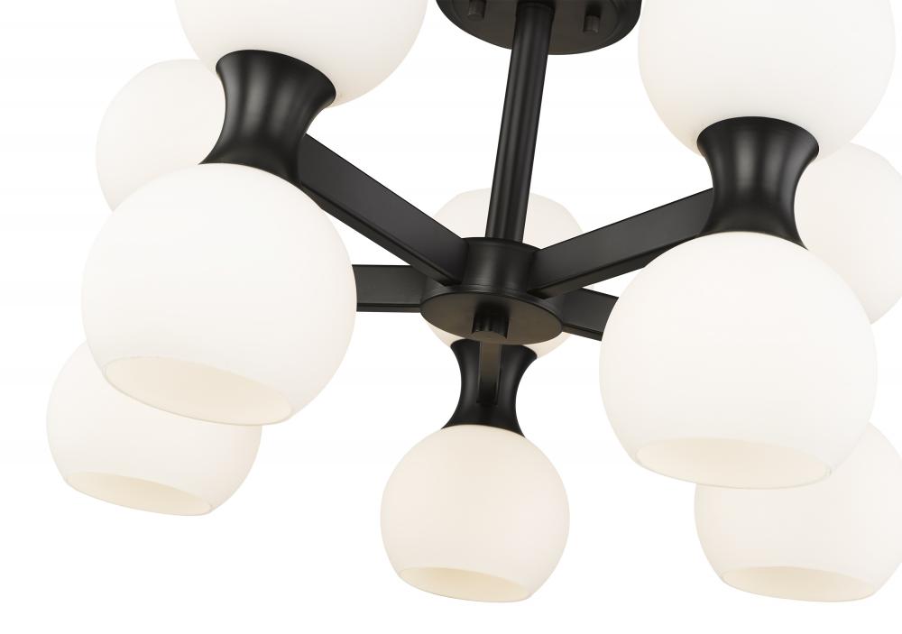 Make Mid-Century Modern aesthetics extend from floor to ceiling with a chic light fixture adding Art Deco influence and a crisp finish contrast. This semi-flush mount ceiling light from the Artemis collection invokes transitional and modern elements with a matte black finish steel spoke frame and gently curved shapes that cuddle matte opal glass globe shades. Downlighting and uplighting equal ambient illumination perfect for a kitchen, dining space, or entryway.