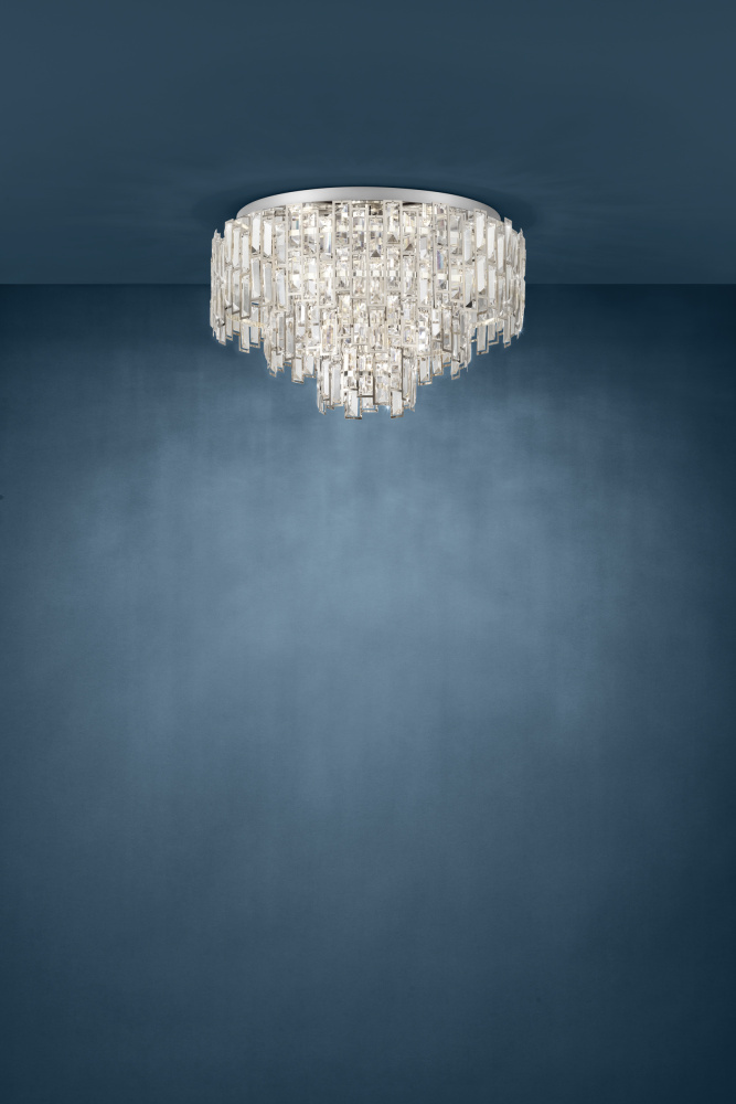 The Calmeilles 1 flush mount features layers of cascading crystals, each suspended within a delicate chrome-colored metal frame. Rows of crystals taper down to a point, creating a glamorous focal point. The high-end beveled glass crystals create a sparkling, sophisticated look as soon as the light is illuminated.