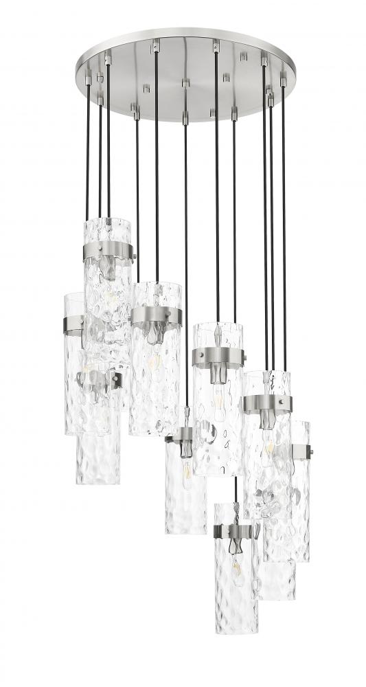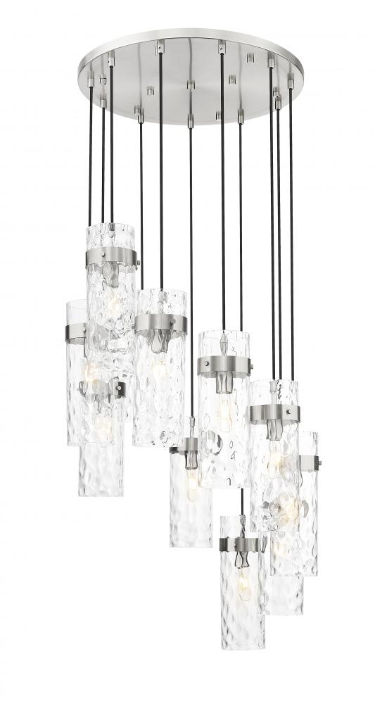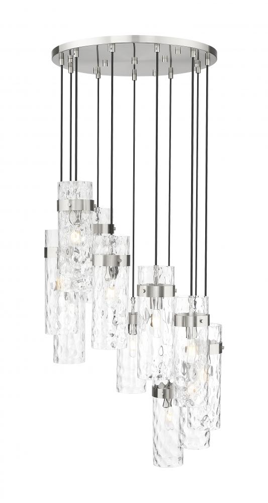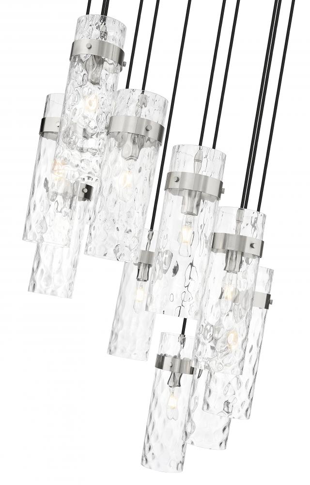 Chic cylinders of rippled water glass create a sophisticated presence in this modern 11-light chandelier. Its spiraling silhouette and round canopy pair with braided cord and a brushed nickel finish, creating a bold, gleaming focal point over your foyer or living room.