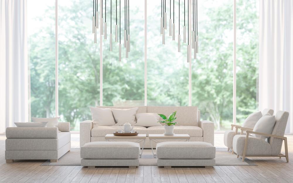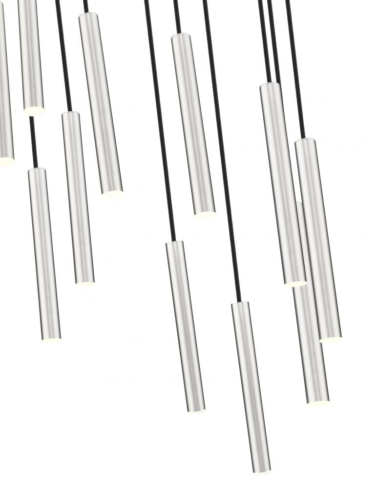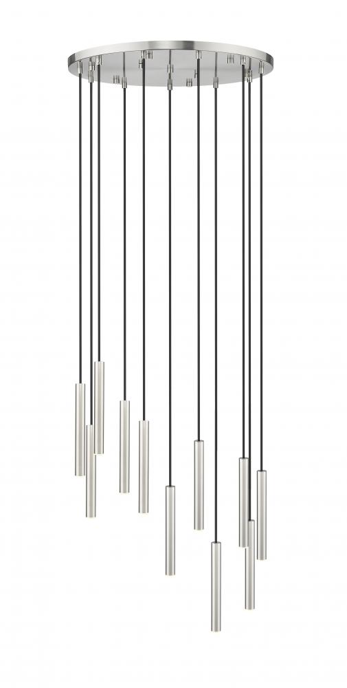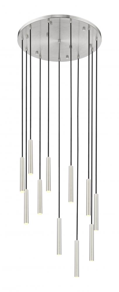 Cool and precise, this modern 11-light chandelier is a stunning focal point. Staggered lights feature integrated LEDs for energy efficient illumination, while a brushed nickel finish encourages its clean, fresh look and feel over an entry, dining table or staircase.