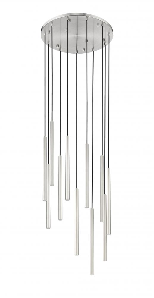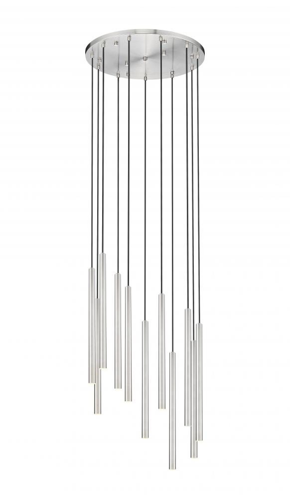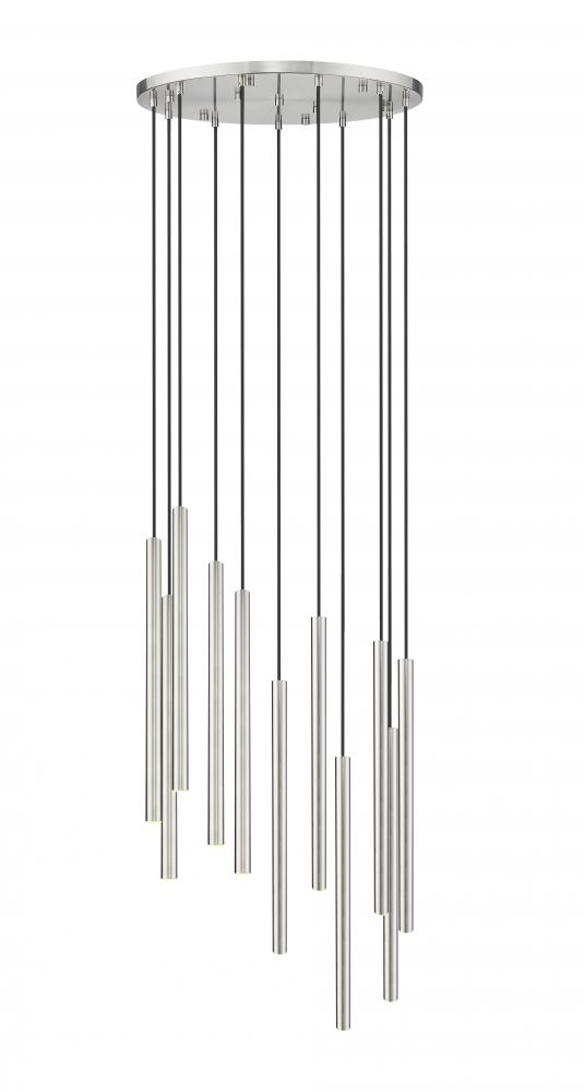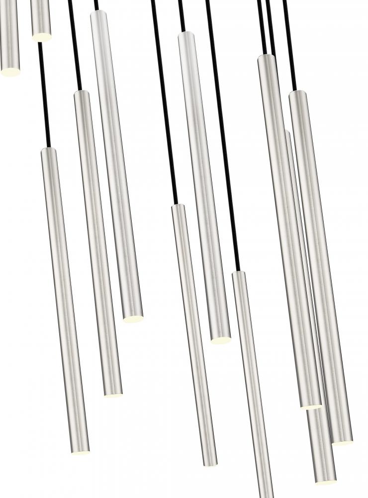 A cascading fall of slim, staggered lights create a superb silhouette for this modern 11-light chandelier. From the Forest collection, its a sophisticated design complete with a round canopy and a brushed nickel finish that instills sleek elegance. Its integrated LEDs are dimmable and energy efficient, perfect for a contemporary home.