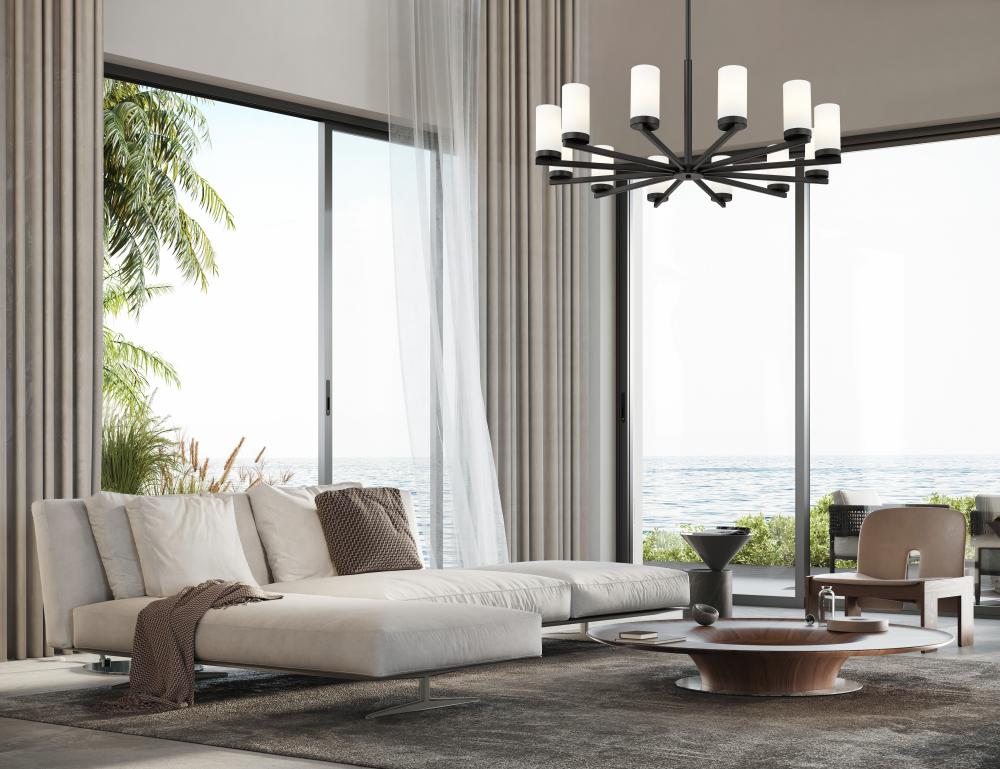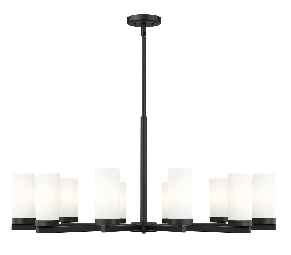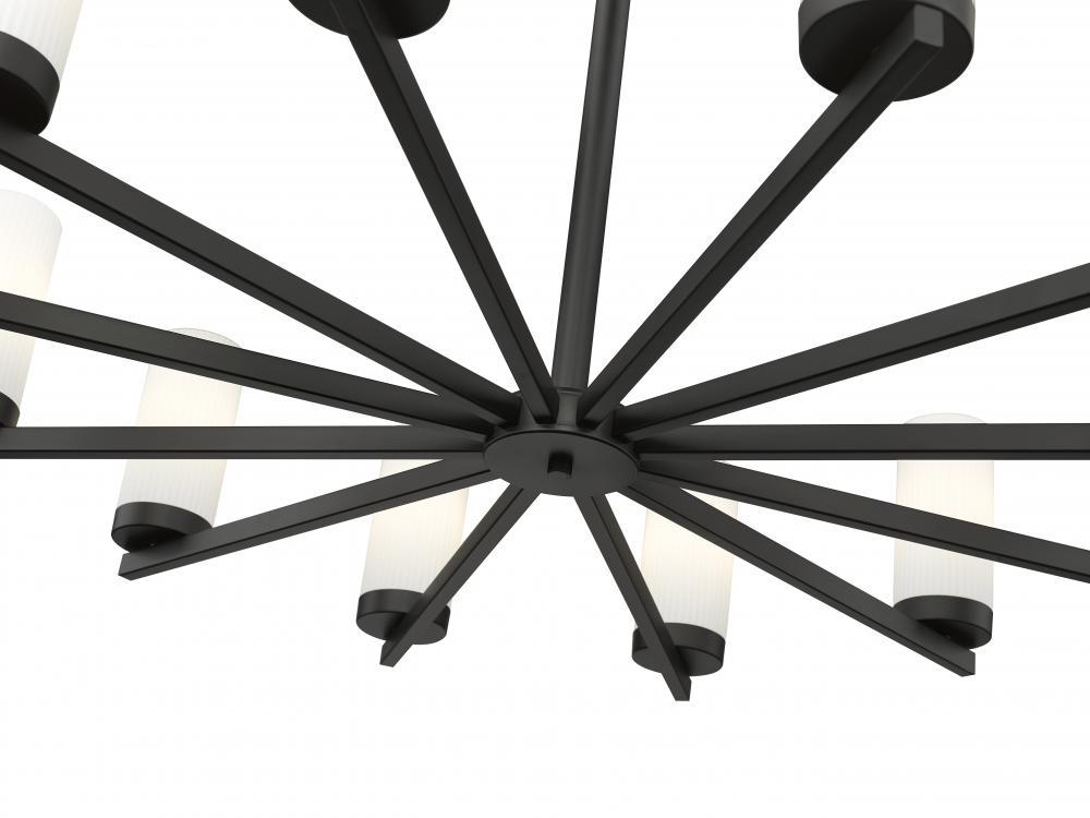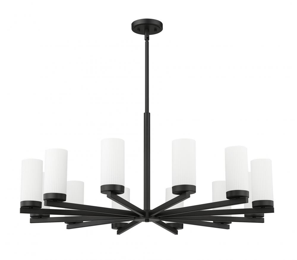 Fresh, clean style infuses a modern 12-light chandelier. Beautiful over a dining table, it shows off a crisp matte black finish paired with twelve white glass hurricane shades that create inviting luminosity. A radial profile and straight arms highlight its sleek allure, offering linear elegance in your kitchen, dining room or foyer.