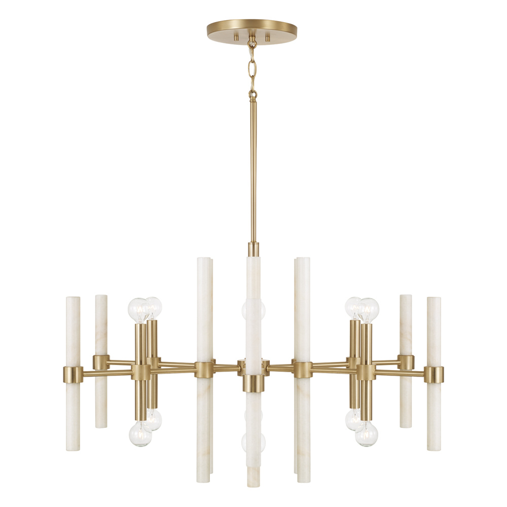 DETAILS: With stunning natural marble pillars and double-socketed Matte Brass candle sleeves, this unique luminaire offers captivating illumination from top to bottom.