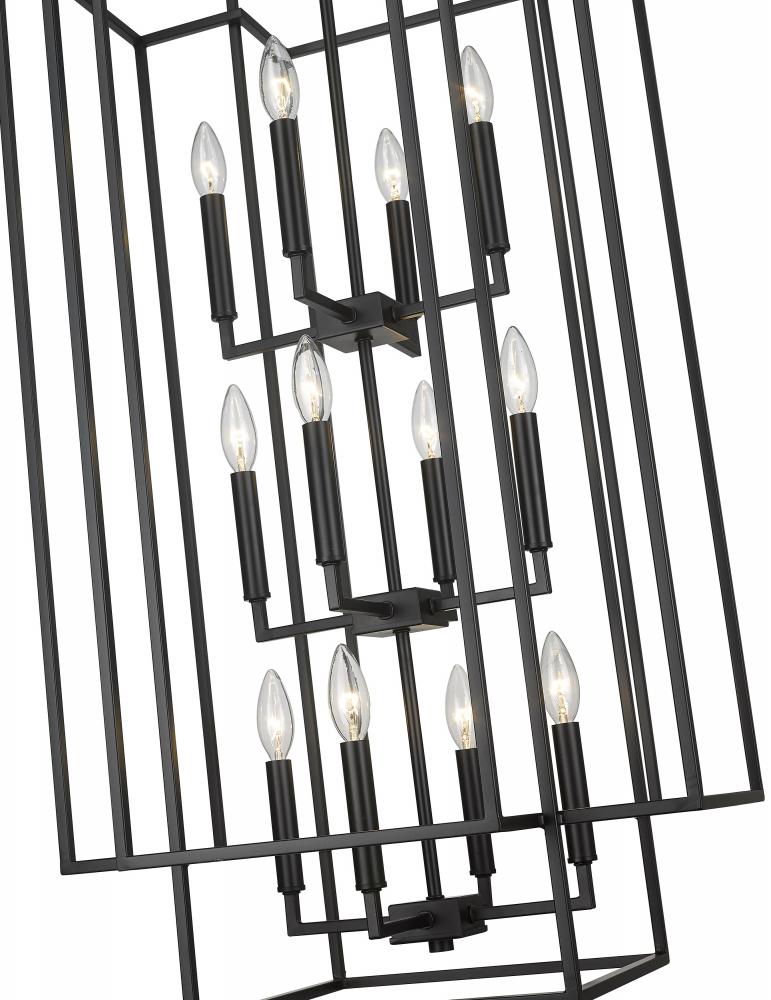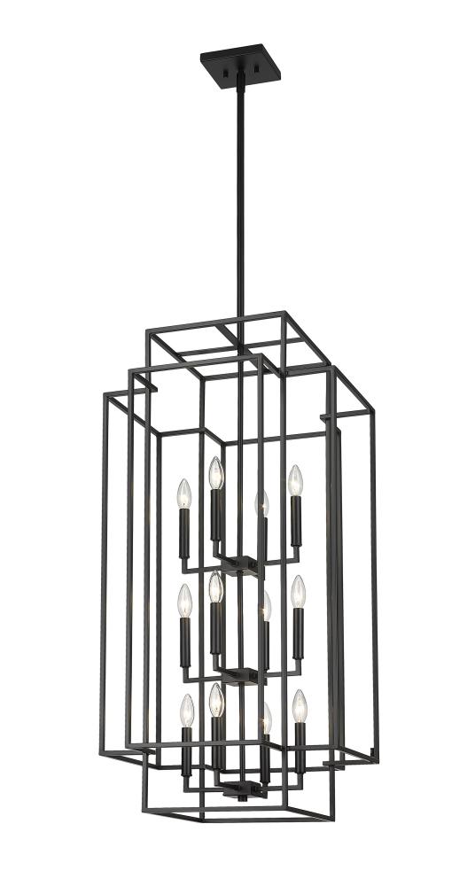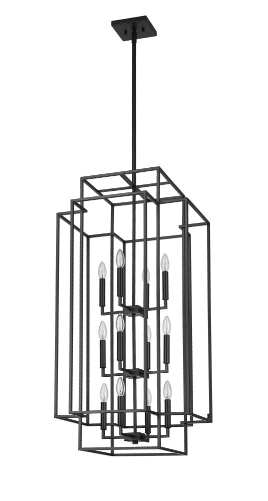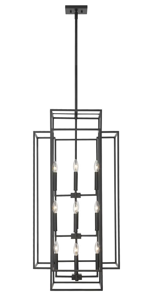 An elongated steel cage offers a grand minimalist aesthetic to this contemporary 12-light pendant, designed with a tall geometric tesseract-inspired shape. Designed with a modern architectural feel and Frank Lloyd Wright-inspired aesthetic, this oversized transitional pendant makes a breathtaking, dramatic addition to museum-like interiors or two-story entryway foyers with high ceilings with its stark matte black finish. Illuminate the entire space with its generous tiered candelabra, showcasing 12 lights within its open and airy black cage.