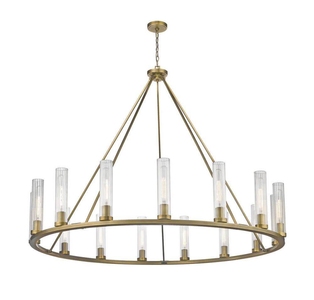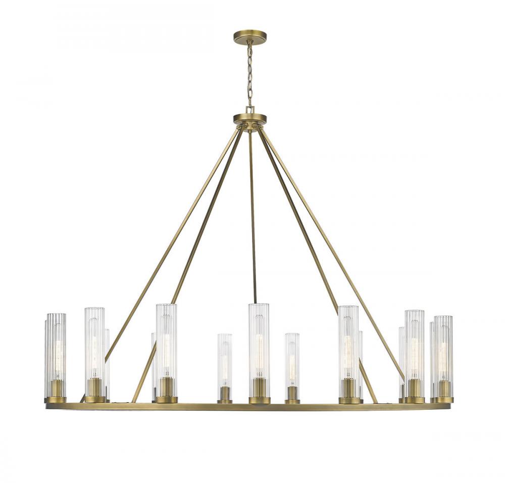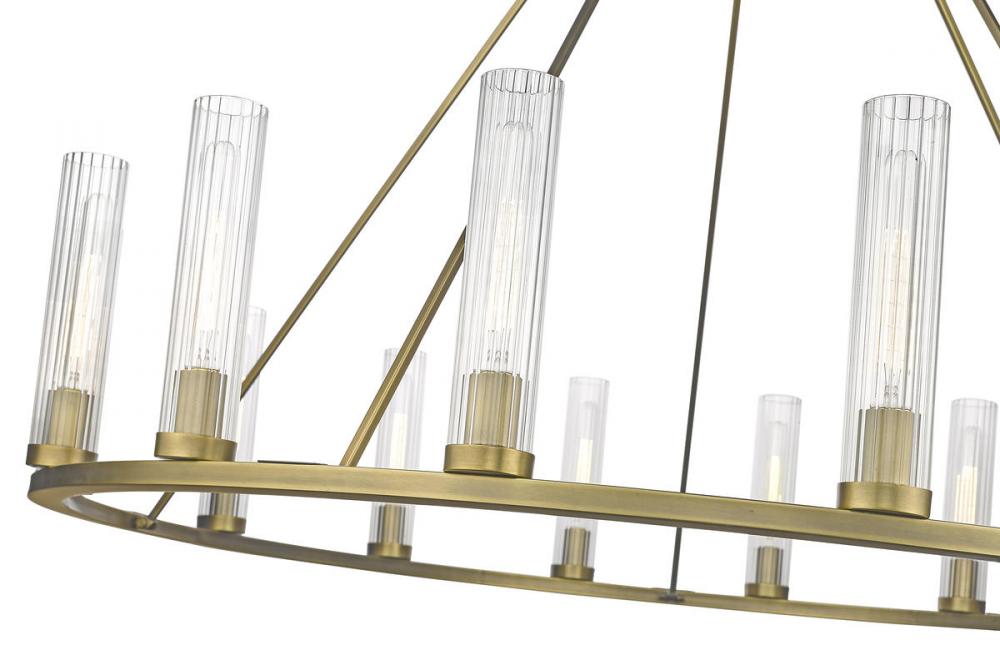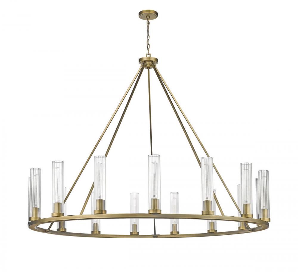 Affixed with fifteen elegant textured glass shades, this round, metal chandelier illuminates a room with soft, diffused light. Add rich ambiance to a dining room or entry with this stately and stylish fixture, featuring a rubbed brass finish ideal for transitional or modern decor.