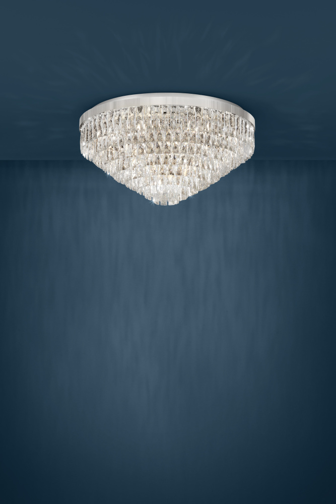 The VALPARAISO ceiling light has a chrome finish, with row upon row of clear brilliant glass elements. The high-end brilliant glass creates a sparkling, sophisticated look as soon as the light is on. The light blends magnificently into modern interiors, creating the right mood in any space.
