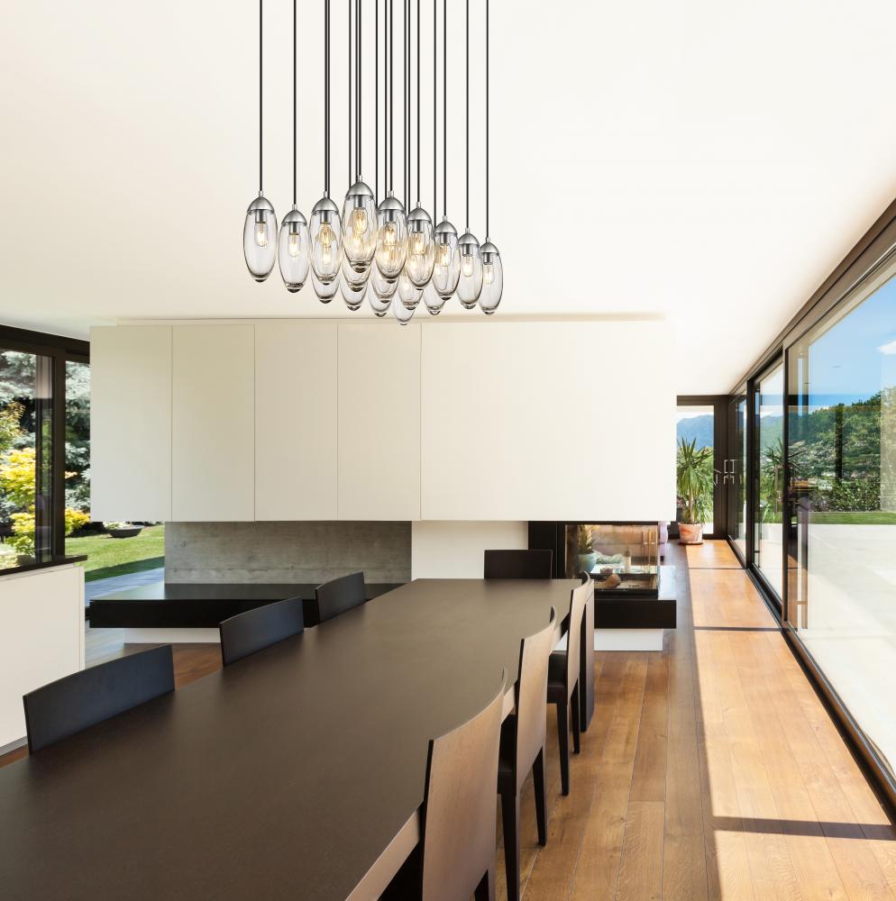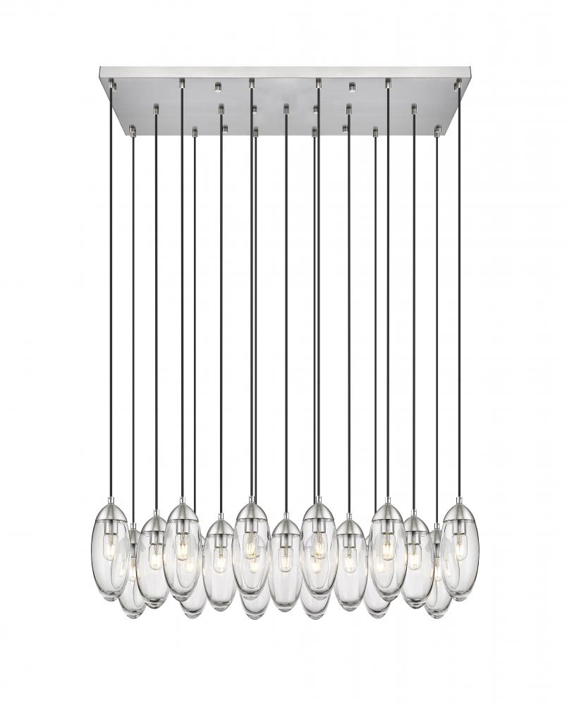 Sensibility and artistry intersect with glam influence as this exquisite 17-light chandelier highlights an island space or dining area. A sense of organic decadence follows dangling oval glass shades in an orderly cluster that delivers simplicity for a calming effect. Choose this chandelier featuring sparkling glass and cool brushed nickel finish metal, an enticing blend created for impact.