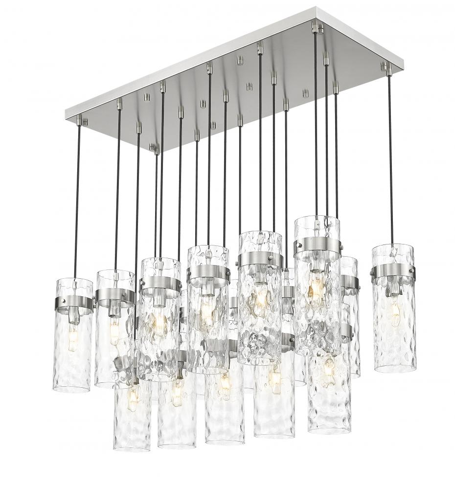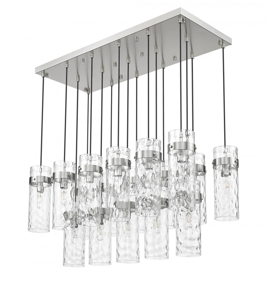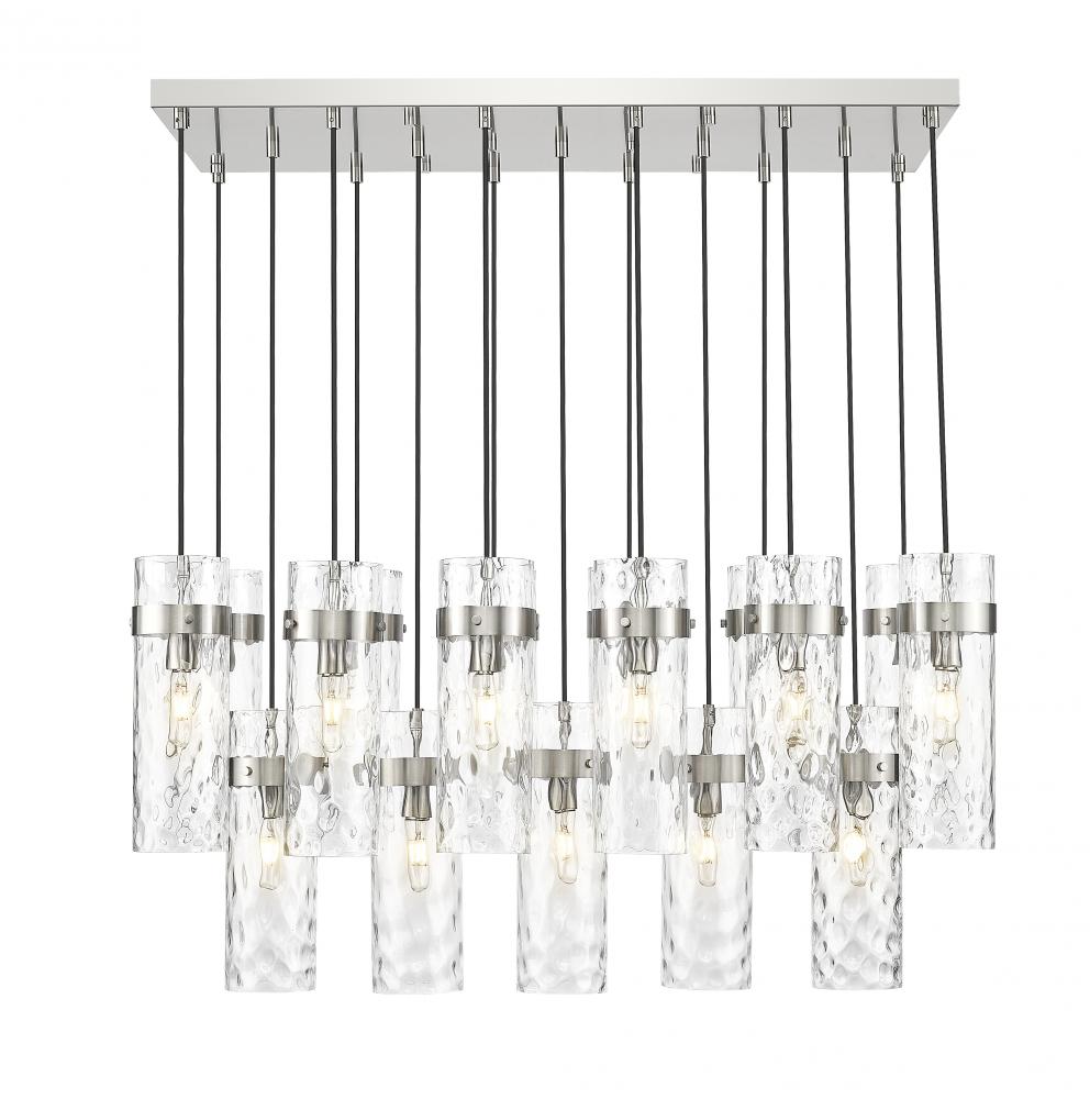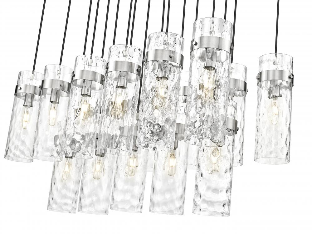 Chic cylinders of clean water glass bring rippled dimensionality and depth to the two-tier configuration of this modern 17-light chandelier. Its linear profile is perfect for foyers and dining rooms, delivering bright, inviting illumination. A brushed nickel finish pairs with a braided cord, delivering opulent style and sophistication.