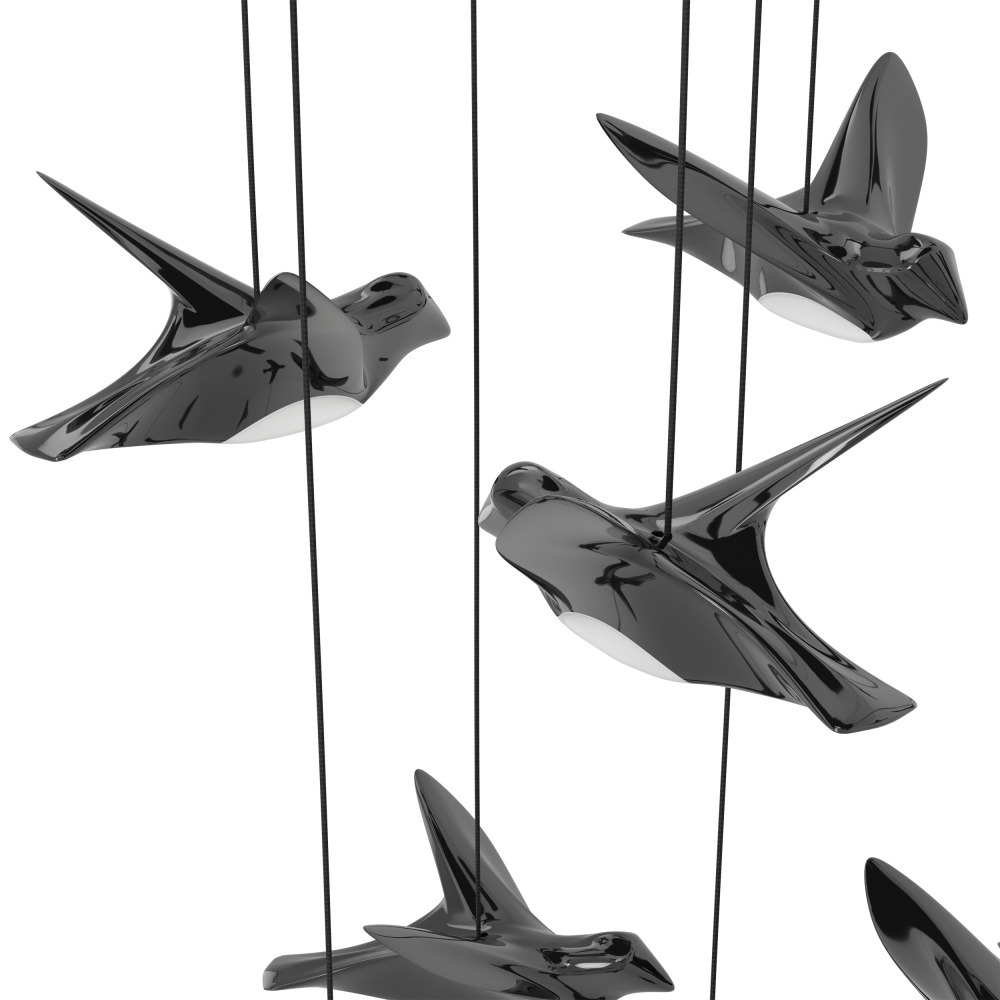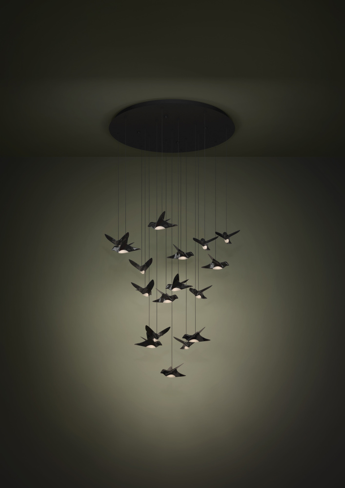 The PARATEBUENO LED cascade pendant consists of a round black canopy, from which 17 black chrome birds are suspended on black textile cables. The integrated LEDs on the birds' bellies provide pleasant warm white light. The hanging lamp fits perfectly into modern installations and, thanks to the special suspension, is reminiscent of a mobile.