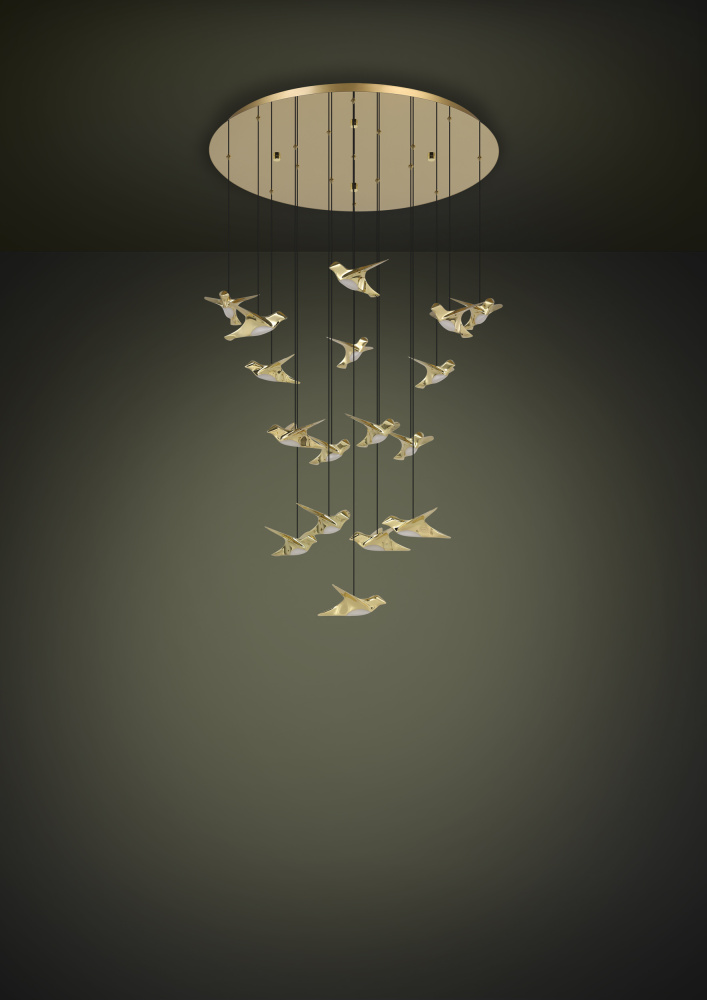 The PARATEBUENO LED cascade pendant consists of a round brass canopy, from which 17 gold birds are suspended on black textile cables. The integrated LEDs on the birds' bellies provide pleasant warm white light. The hanging lamp fits perfectly into modern installations and, thanks to the special suspension, is reminiscent of a mobile.