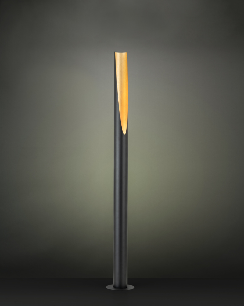 The PREBONE LED floor lamp features a black metal cylinder body and gold leaf coloured inner finish. The lamp casts an indirect warm white light around the room. The slanted design of the light reveals the elegant gold leaf inner surface. The product has a high-end, linear design that provides elegant lighting to create the right mood in any space.