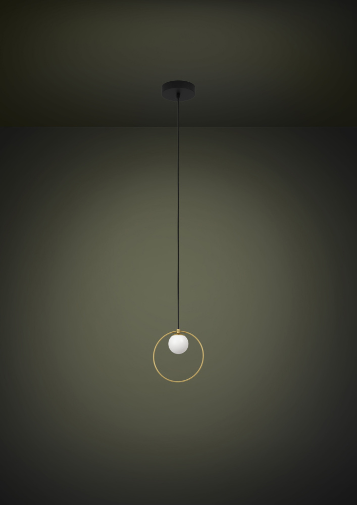 The Portocolom pendant light features a suspended opal orb, hanging inside a slender brass ring suspended from a black bar. The illuminated ball makes the outer ring shine and creates a radiant appearance as soon as the light is switched on, especially when displayed in multiples. The integrated LED light provides pleasant warm white light and can be dimmed using a suitable rotary dimmer on the wall.