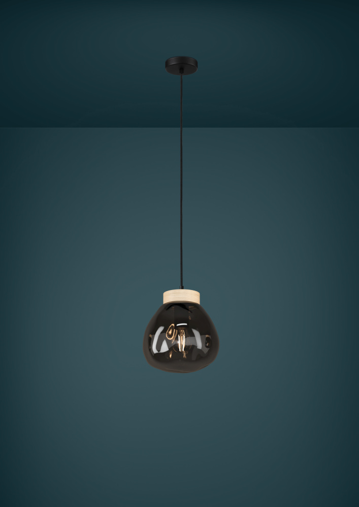 The Magacela single pendant is a perfect mix of natural and prestigious materials. Composed of organically shaped smoked glass shade with a lightly metallic finish and wood accents, this timeless suspended light fits elegantly with modern and contemporary designs. Whether in the kitchen or dining room, this single pendant will add the right amount of charm.