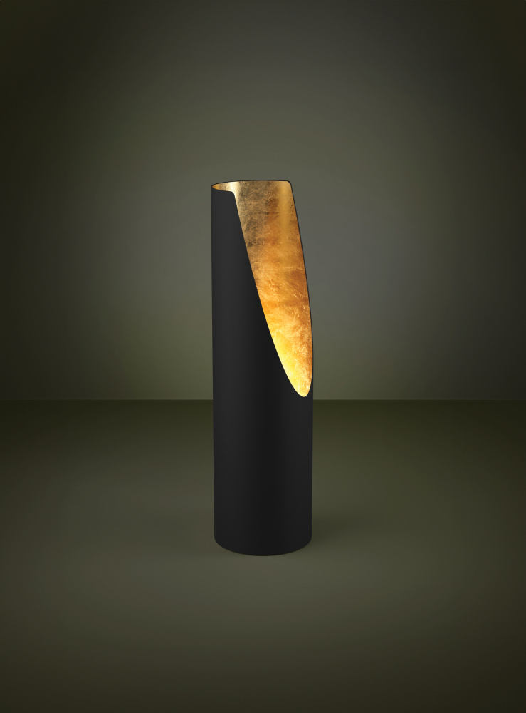 The PREBONE table lamp has a cylinder-shaped black steel body with a slanted upper part revealing the elegant gold leaf interior surface. The table lamp casts a pleasant warm white light indirectly around the room. The cylinder design provides elegant lighting that will create the right mood in any space.