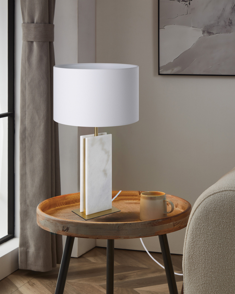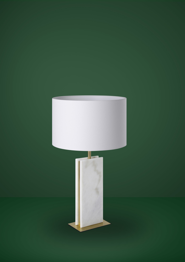 The Belesar table lamp is a stunning contemporary work of art featuring two rectangular slices of authentic stone mounted side-by-side atop a rectangular metal base. A white linen drum shade completes the look. This lamp is solid and heavy, and naturally occurring variations in the stone mean no two are exactly alike.