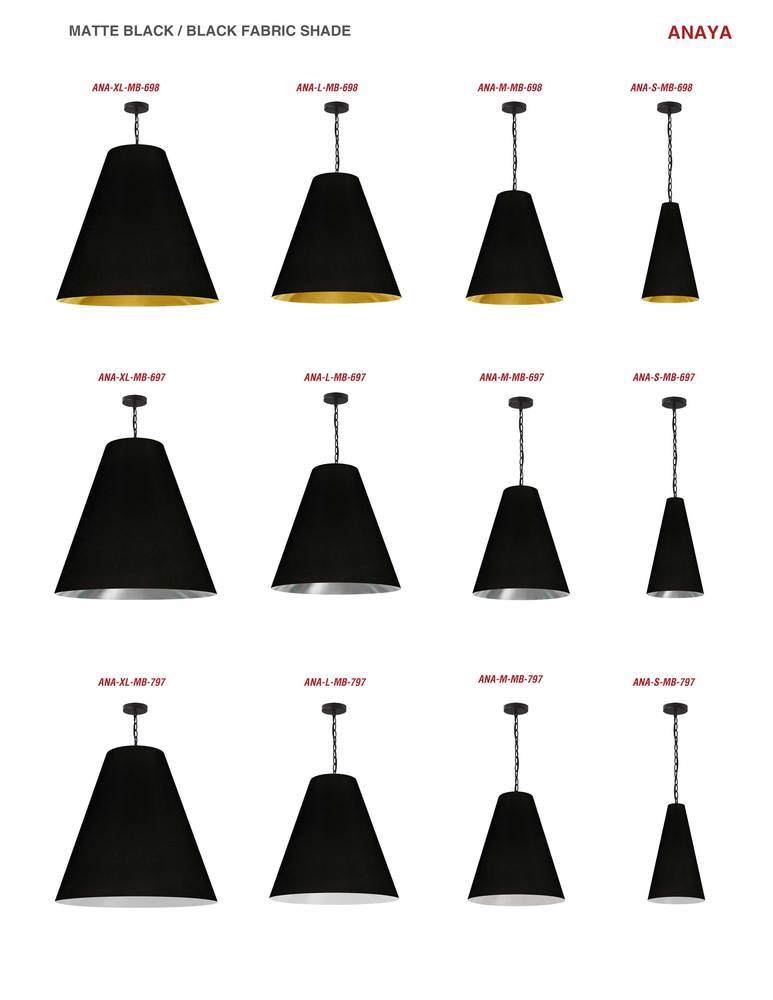 A chic silhouette gives the Anaya family of lighting a decidedly fashionable appeal. The elongated and tapered shape that dominates the design creates an elegant note of luxury. The stylish tapered drum shade covers a metal frame, and hangs from a chain drop. The fabric shade and metal base come in a variety of colorways, including monochromatic options, as well as those with contrasting colors on the inner and outer shade. Like the perfect accessory to an outfit, Anaya lighting adds a pop of designer style that blends easily into modern, contemporary or transitional furnishings.