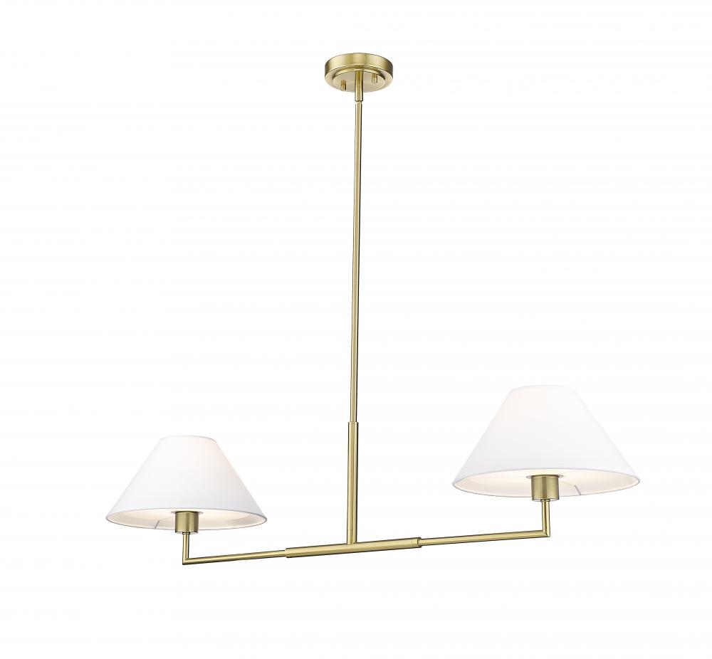 The power of modern simplicity is highlighted in a chic two-light linear chandelier thats equally impactful over a kitchen island as in your bedroom or living area. Its clean lines are accentuated with a warm luxe gold finish over steel construction, while a pair of white linen empire shades are beautiful and timeless in any room. Casting inviting illumination for tasks and ambiance, this chandelier is a stylish fit in myriad spaces.