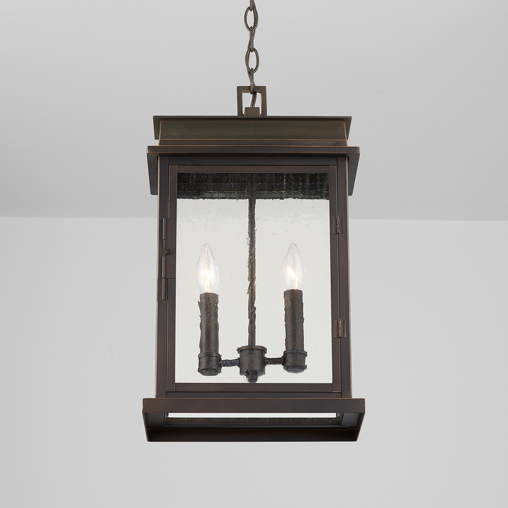 Our Bolton 2-light hanging lantern brightens your porch or covered deck with two candle-style lights encased in textured antique glass. It's a refined addition that adds updated English style to your home in our timeless Old Bronze finish.