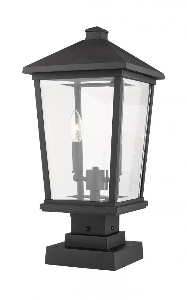 Add a decorative aesthetic to an exterior garden or walkway. Mounted to a post, this black finish outdoor post light features a charming village design with a clearly visible two-light candelabra bulb base.