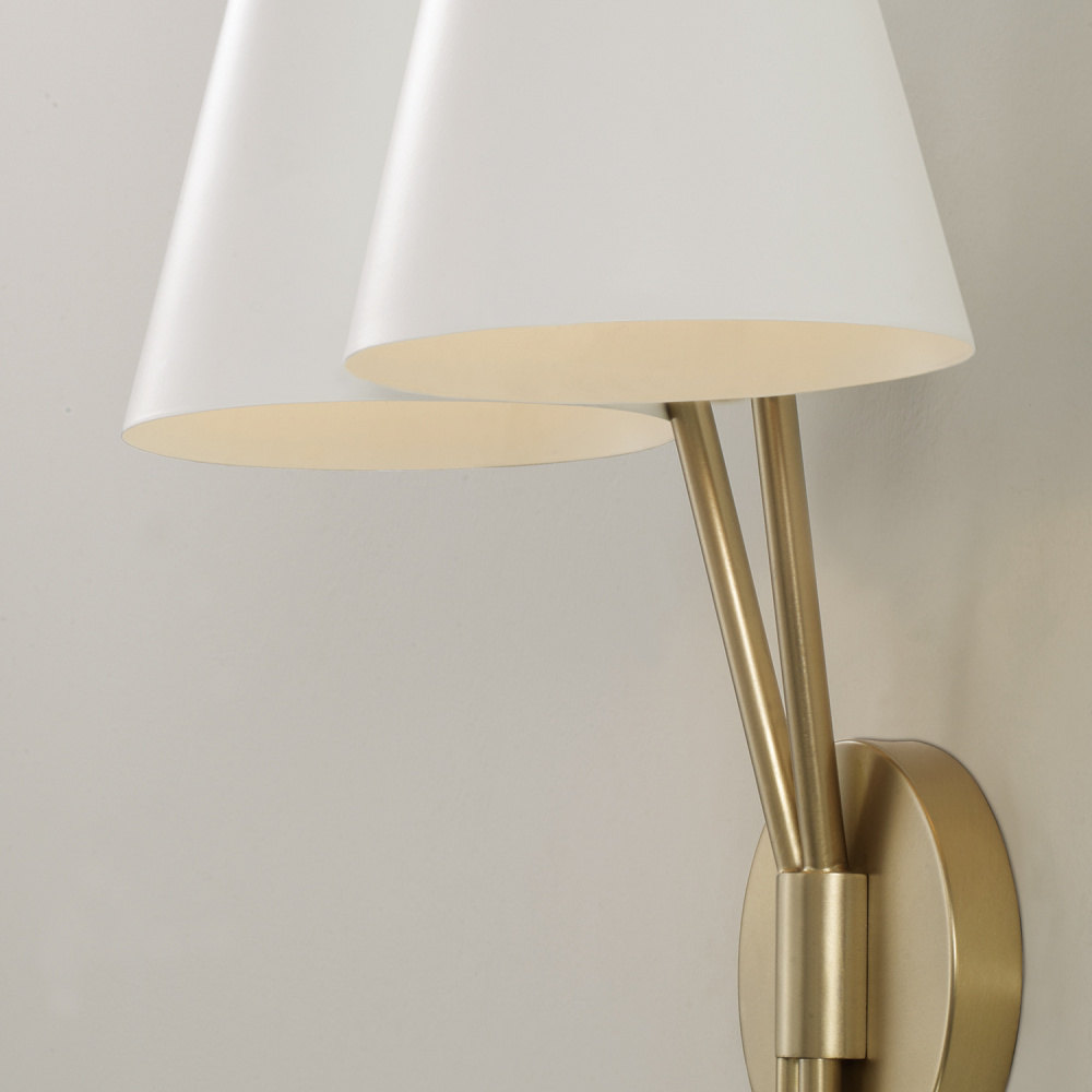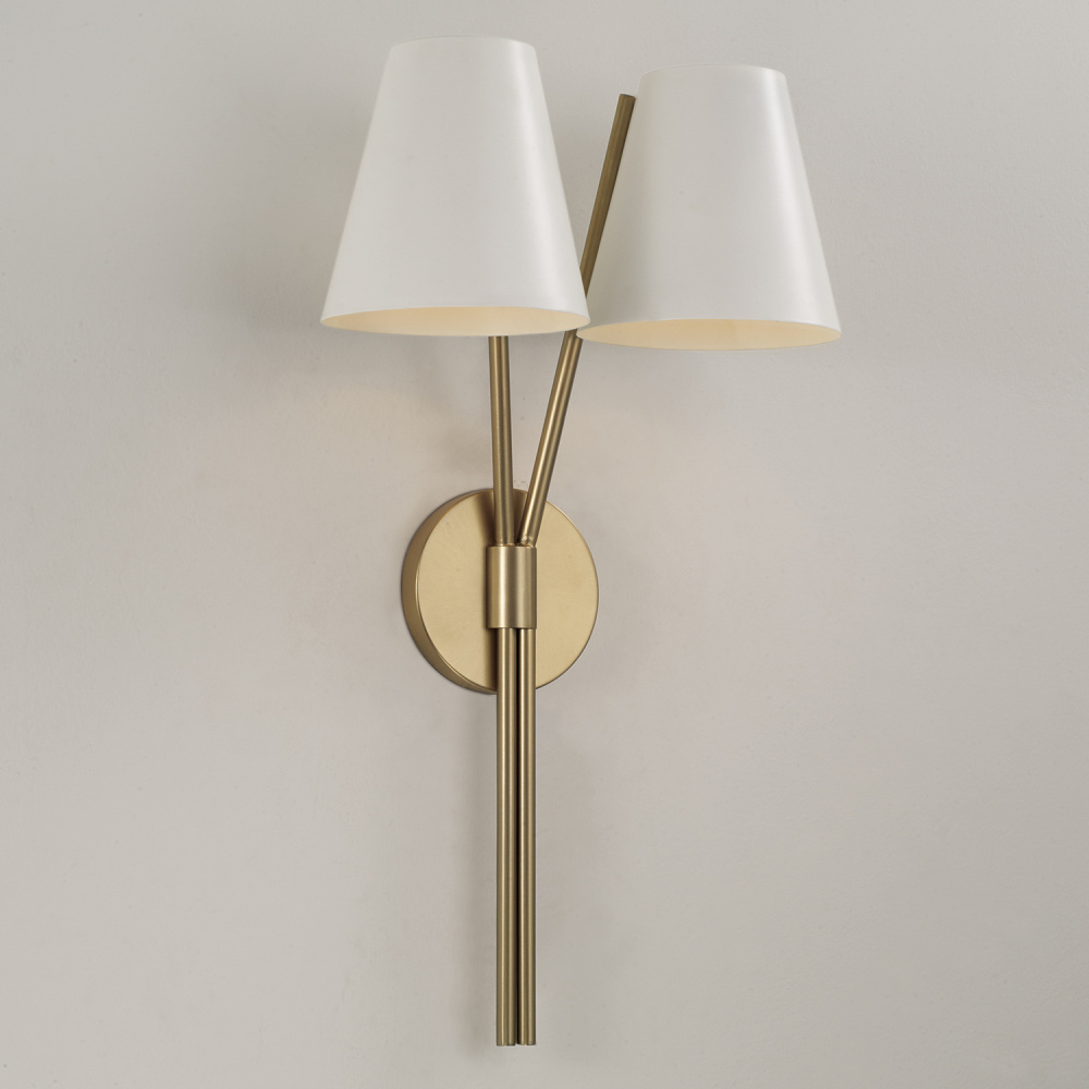 DETAILS: Classic at first glance, the sleek silhouette becomes modern with two-tone appeal from the tapered White metal shades and Aged Brass finish.