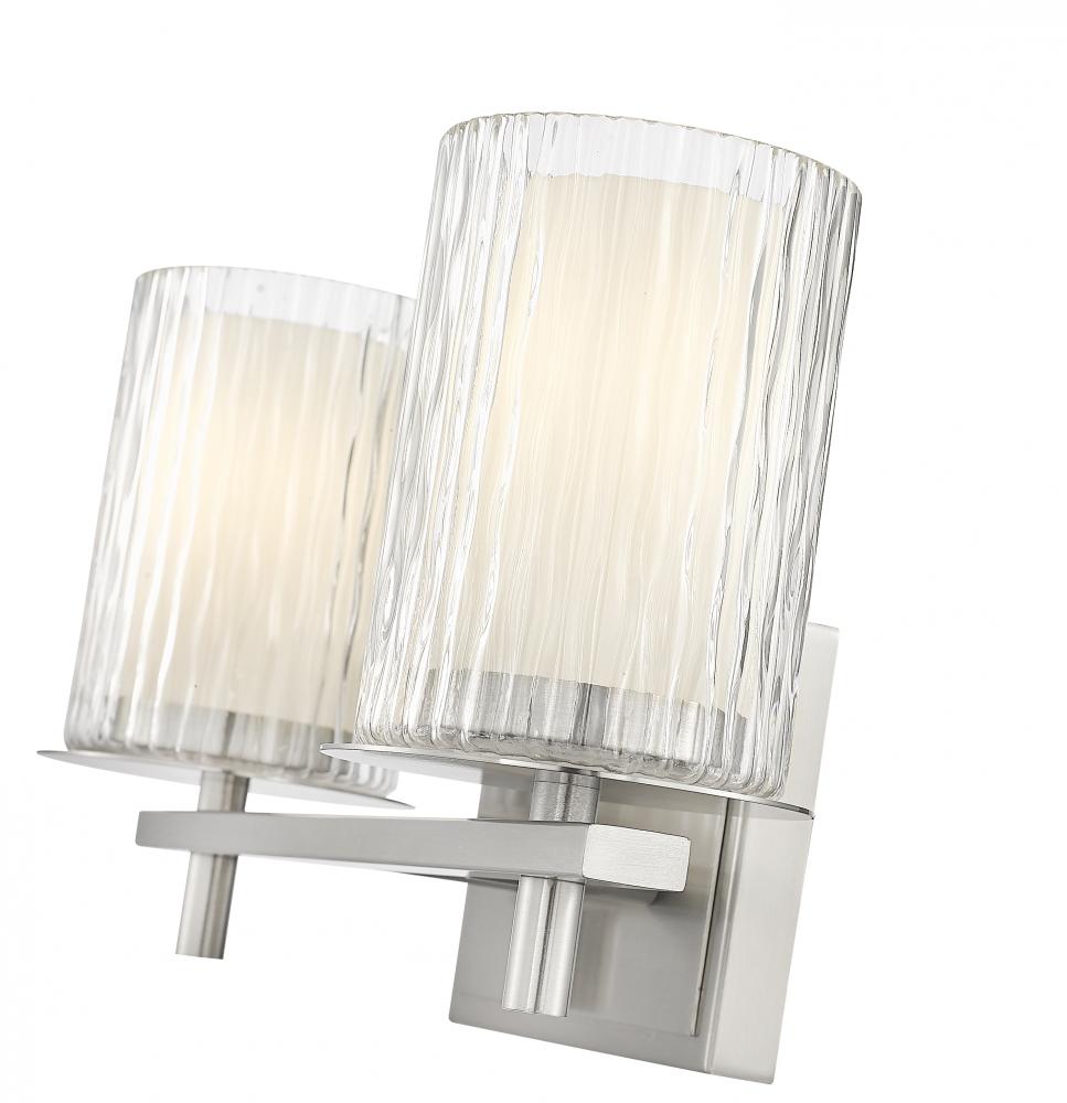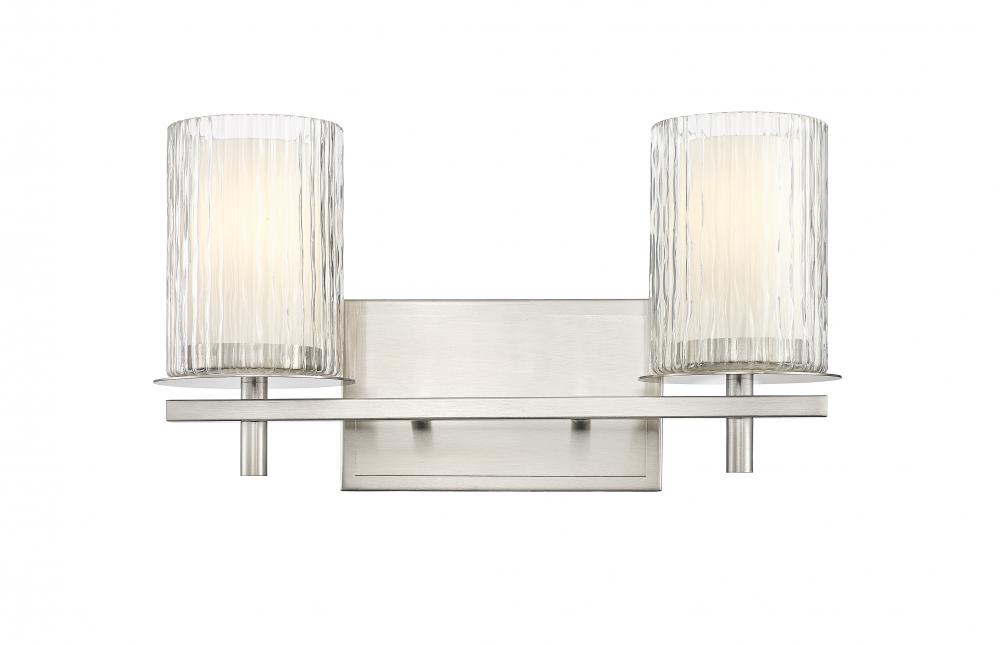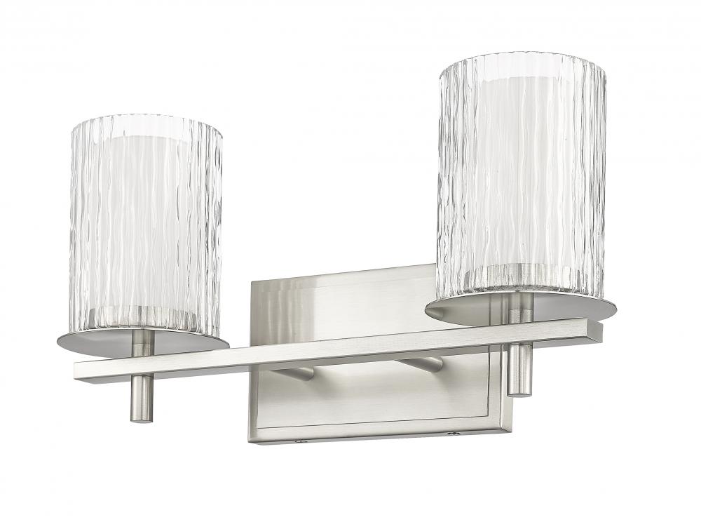 Timeless beauty follows the layered multi-part design of a glass and steel two-light vanity light, a perfect solution for conquering lighting challenges in a contemporary space. Intricate detail is textural and artisan with clear glasswork in a cylinder shape, with an inner white diffuser. Etched opal and clear glass blend as they enhance chic brushed nickel finish framing and show off a crisp mix of circles and lines.