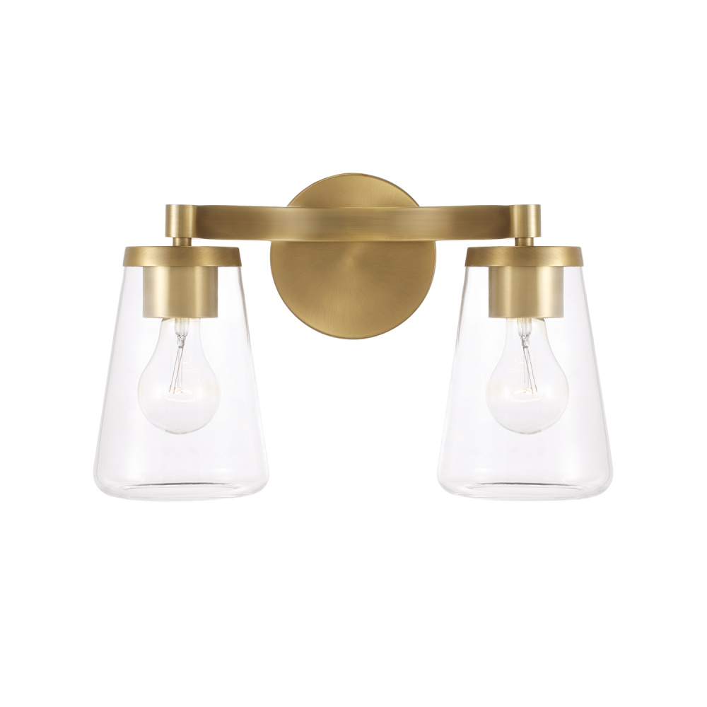 DETAILS: Held by a curved arm, the tapered clear glass shades create classic style with an elegant Aged Brass finish.