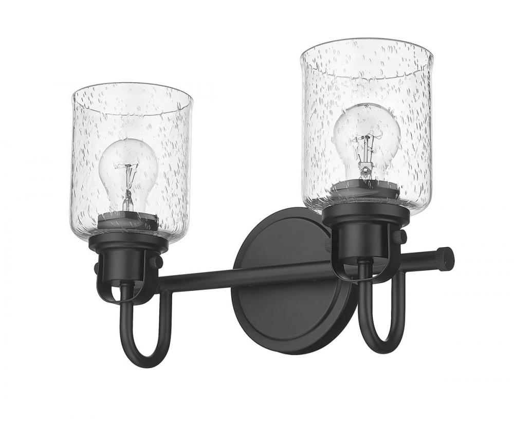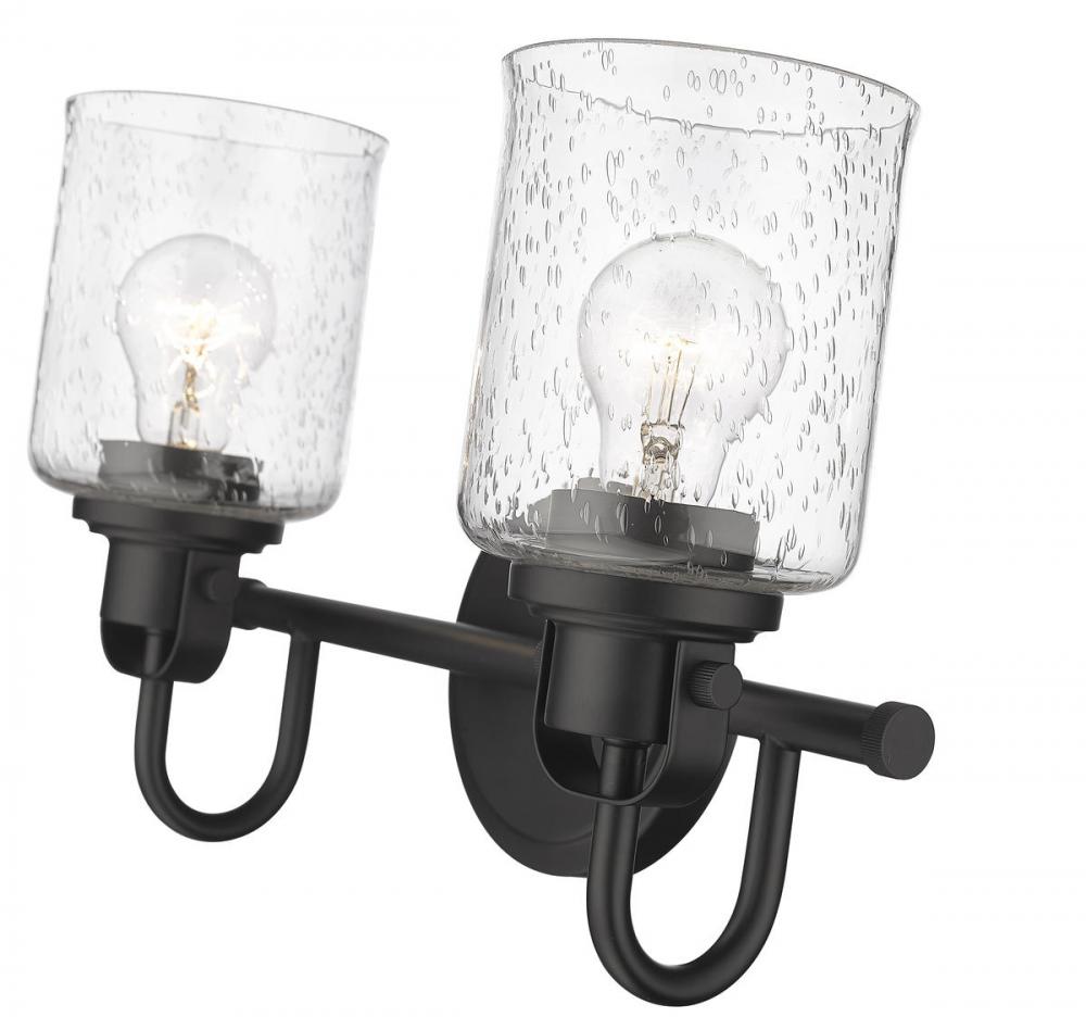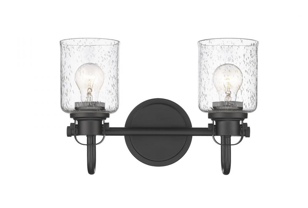 Urban and alluring, this matte black two-light vanity fixture brings a pop of metropolitan flair to any hallway, bedroom or bathroom. Featuring steel construction with a clear seeded glass shade, this wall sconce provides optimal ambient lighting.
