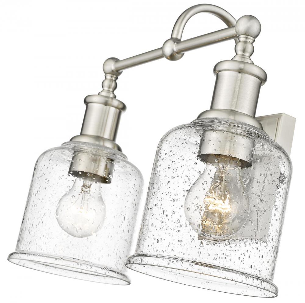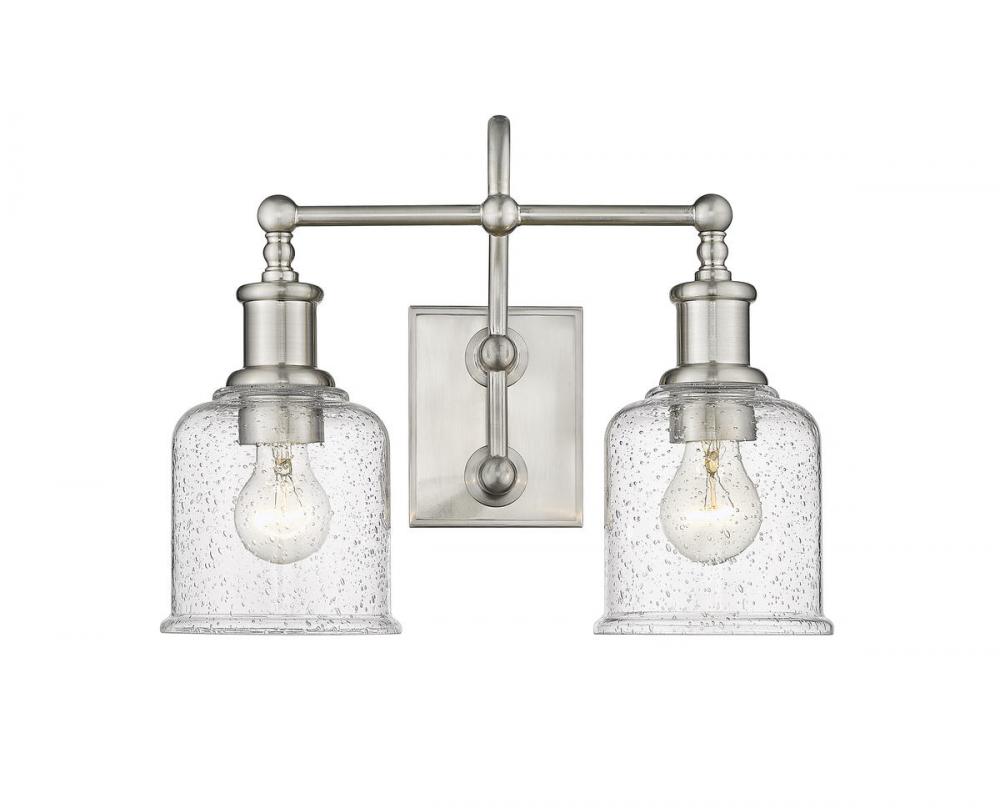 Choose a vintage industrial look with nautical influence, adding this two-light vanity light from the Bryant collection. Embrace a cool brushed nickel finish steel frame and mount, blending beautifully with clear seedy glass shades. A curved arm, ornate holders, and lipped shades generate extra charm that stylize a custom bath space, dining area, or main living room.