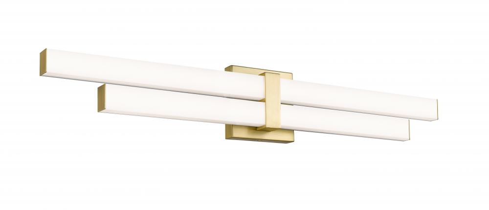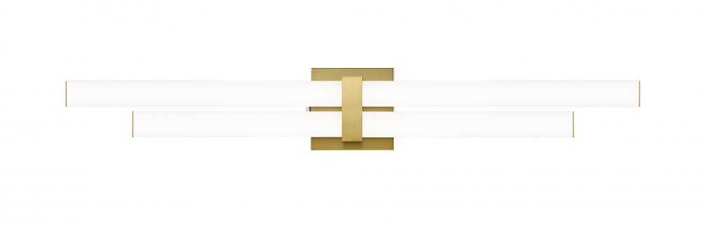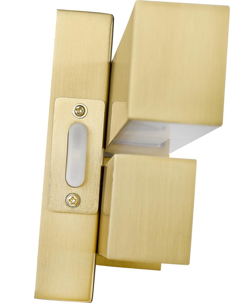 Make a statement in a modern bath space with the structural geometric design of this two-light vanity light. Aluminum framing and accents offer a chic modern gold finish, as graduated frosted bar diffusers align vertically to emit dimmable LED lighting with a customized option of white color values.
