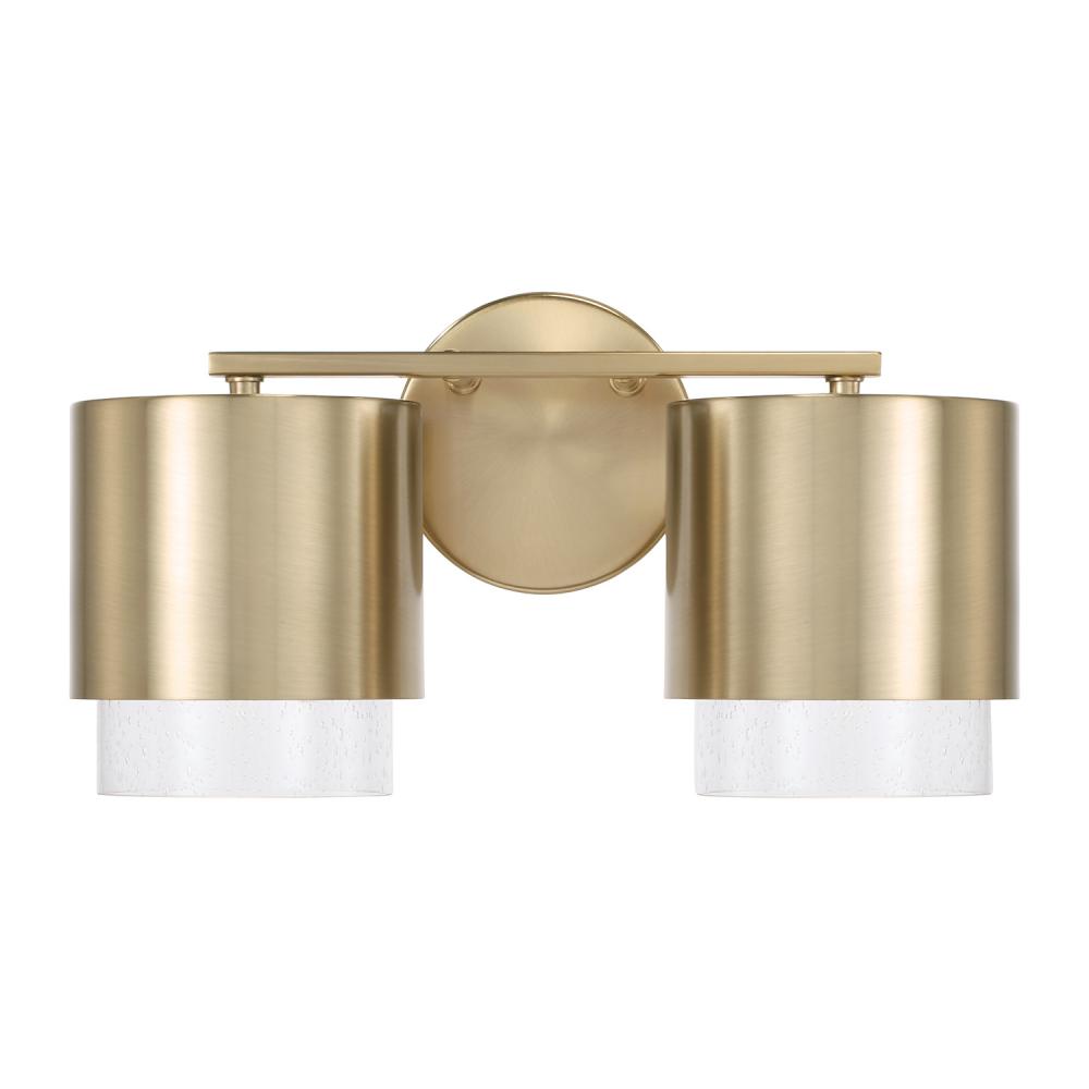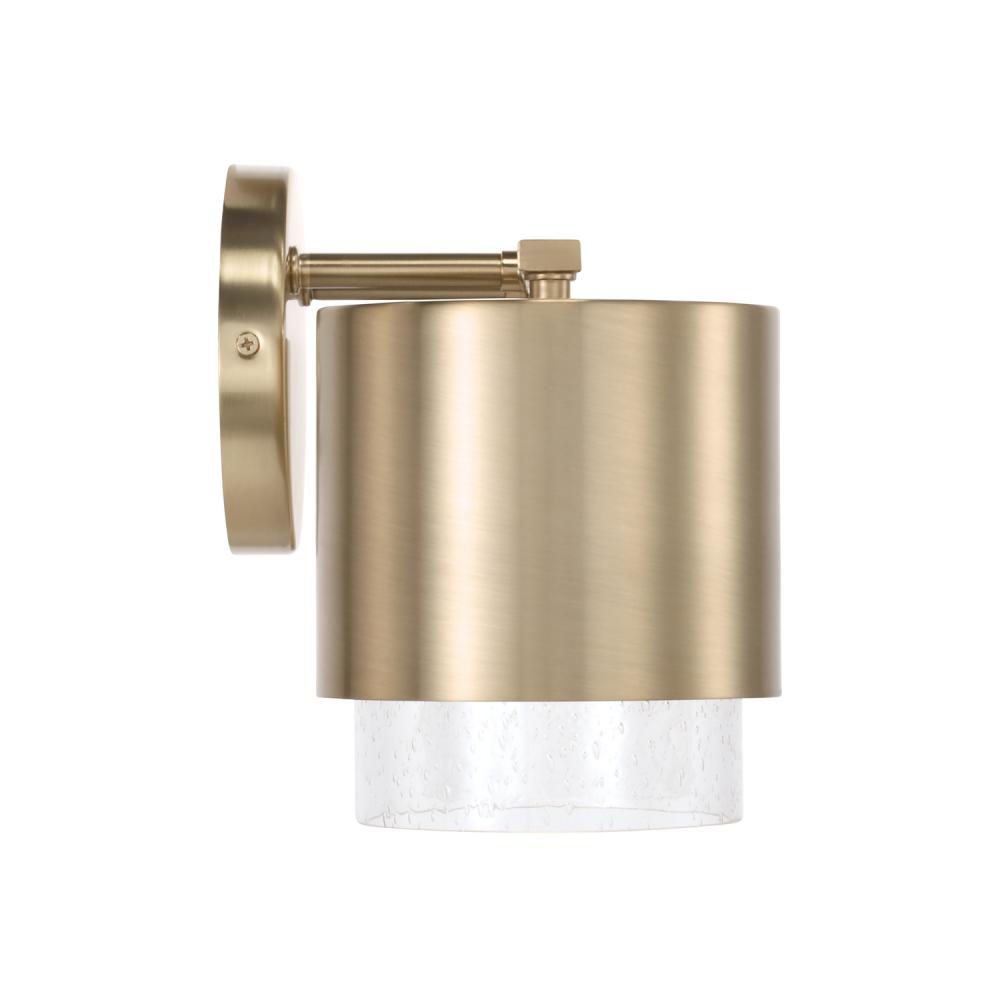 The cylindrical Matte Brass metal shades compliment the seeded glass details for a sophisticated mix.