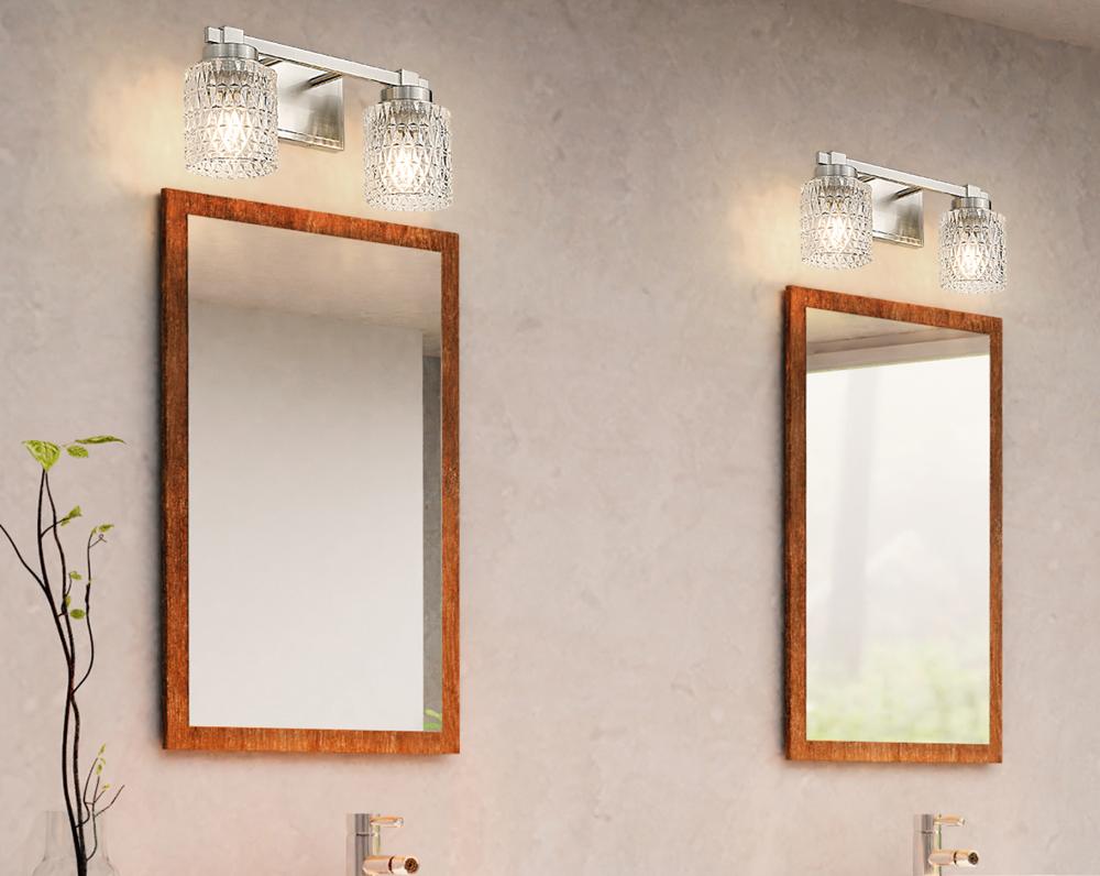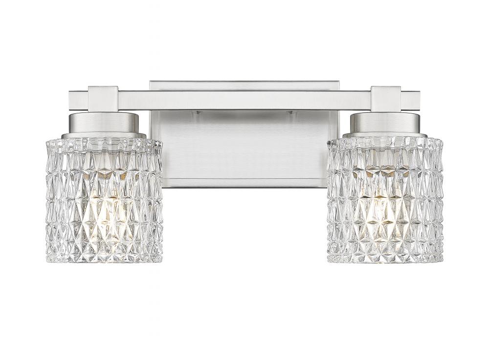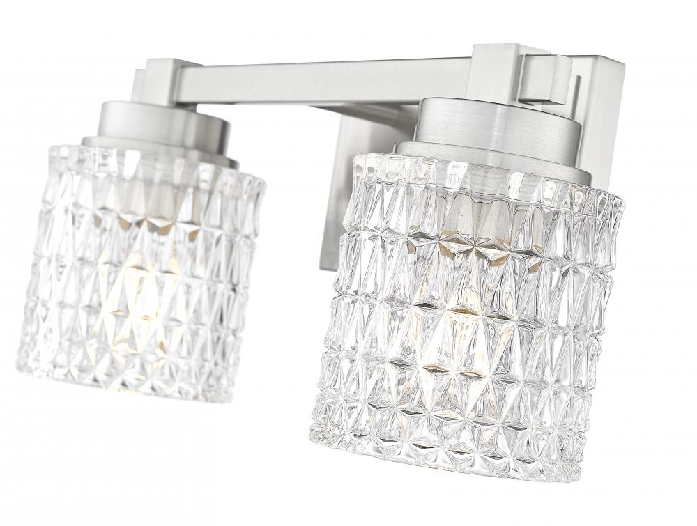 Crystal cut diamond patterning adds a textural quality to shades of this two-light vanity light, a decadent addition to bathrooms and outer living spaces. Timeless style features subtle detail on a brushed nickel finish steel frame, offering versatility and timeless design elements. Dim lighting to suit custom needs or create mood illumination.