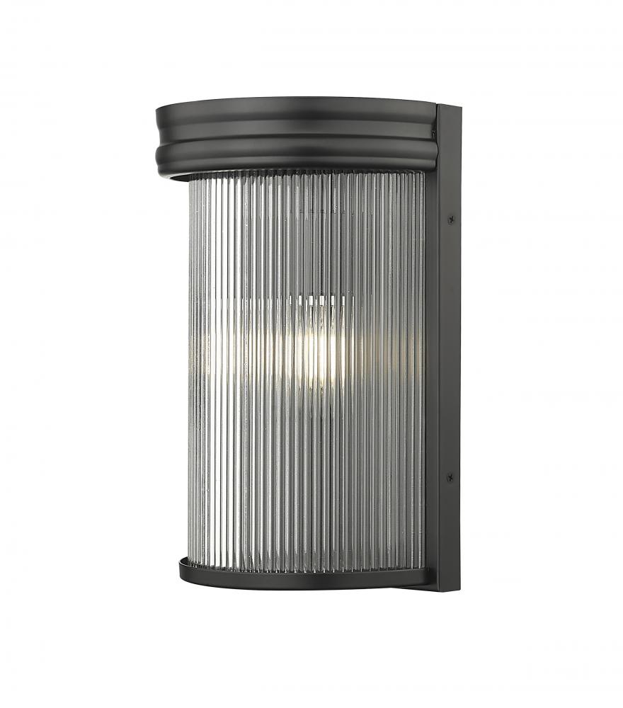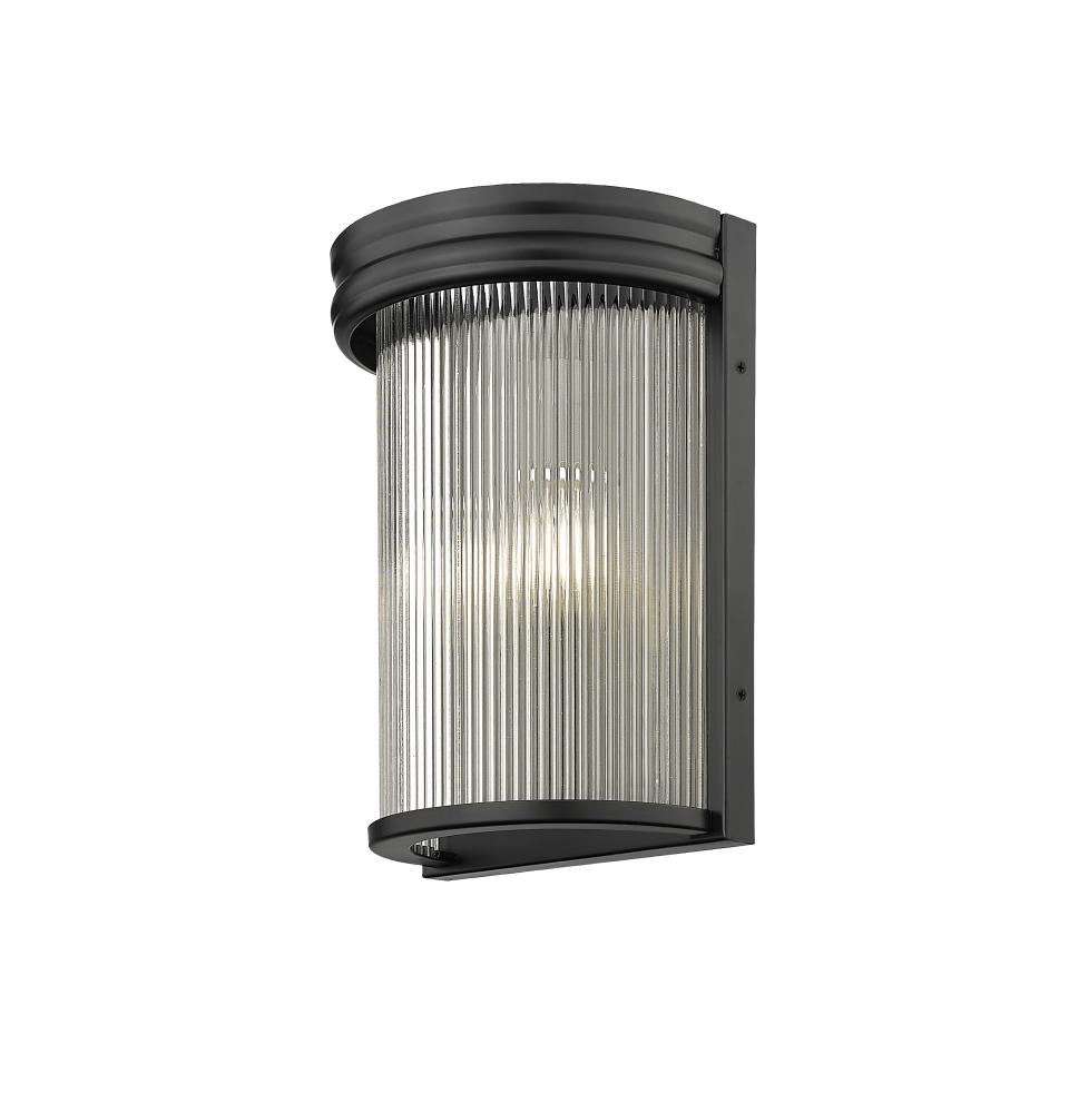 A deep matte black finish brings casual versatility to a modern two-light wall sconce. Distinctive architectural glass is ribbed vertically to refract light and create a sense of opacity, offering excellent light diffusion and a bold, artistic touch. A striking upgrade for your foyer, hall, or living room.