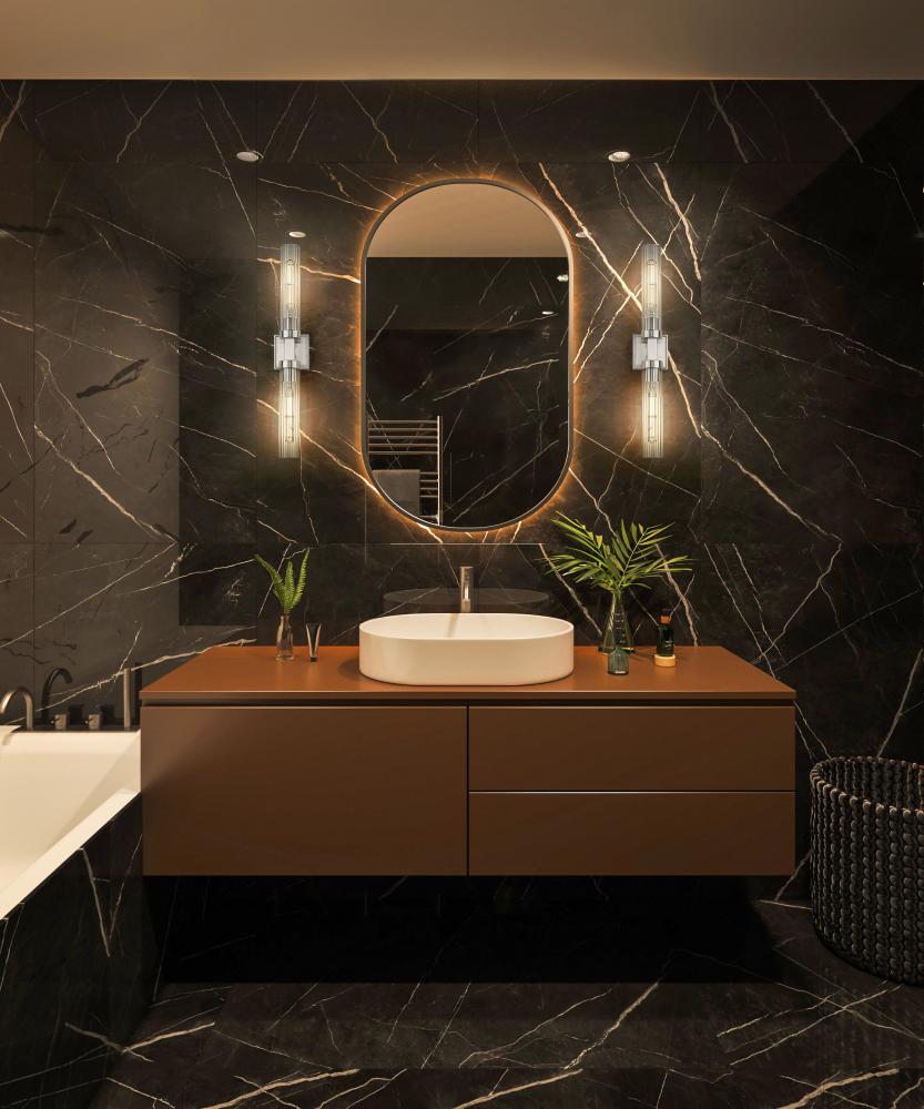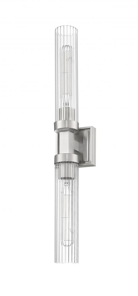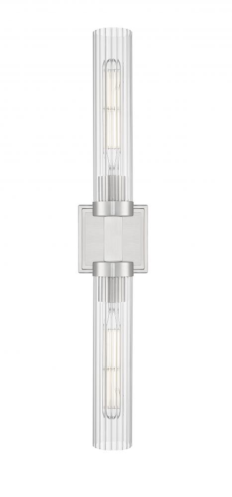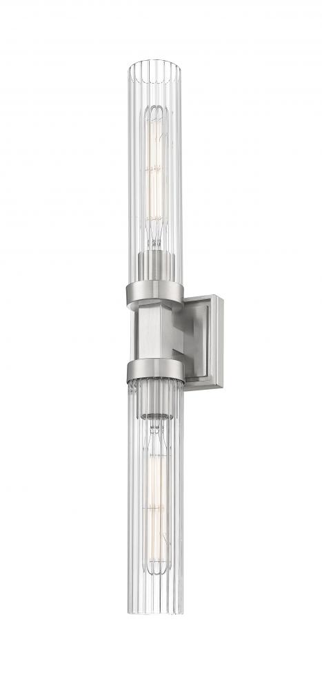 A double-ended design brings versatility and structure to this modern two-light wall sconce. Its linear design features a square wall plate and a cylindrical fixture at its center, finished in brushed nickel, creating a sense of precision and balance. Shades are slim cylinders of clear ribbed glass, adding the delicacy of fluting to a superb silhouette.