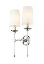 Blending gleaming lines of rubbed brass finished metal with elegant, off-white shades, this two-light chandelier exudes tasteful and timeless style. This sleek fixture from the Emily collection enhances traditional dining d?cor with a classic character and a warm, inviting glow.