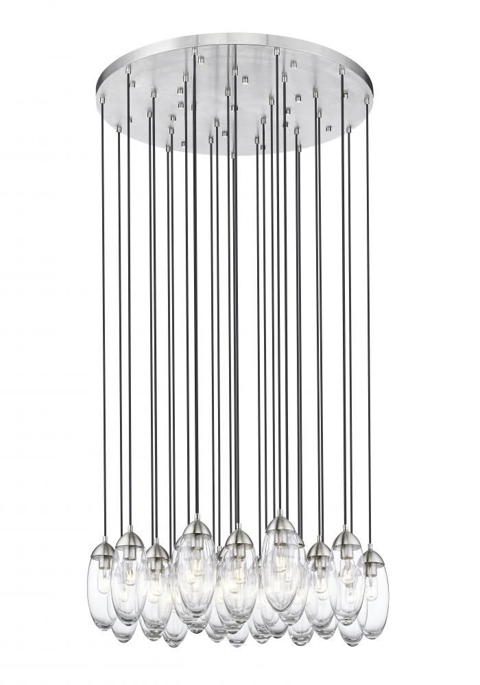 Light reflection plays an enduring role in the design factor of a light fixture with an authentic organic personality. Glam goes a bit easy with this 27-light rounded chandelier representing tempered minimalism as it delivers versatility and artistry. Marvel at the radiance of teardrop glass shades dangling in a circle at graduated lengths from a round brushed nickel finish metal canopy, becoming a focal point in a dining room, living space, or entryway.