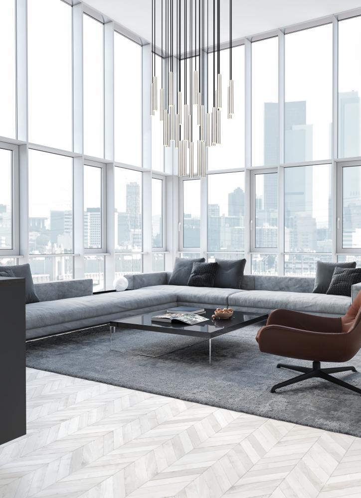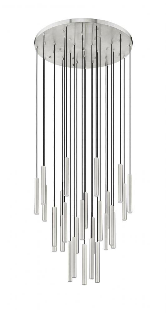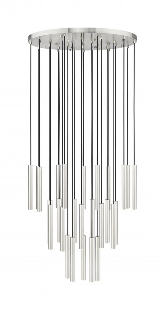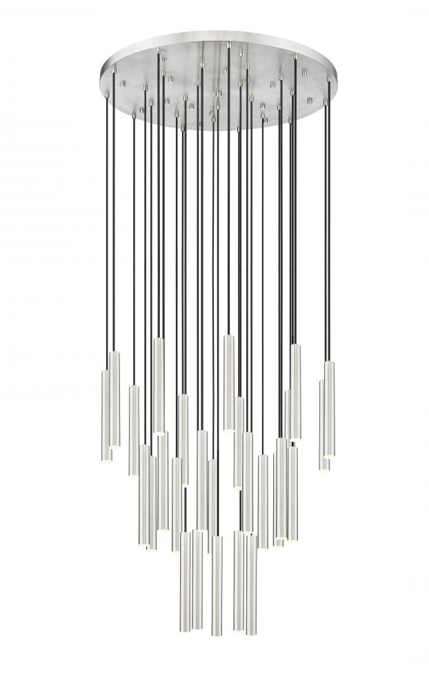 Sculpted simplicity sets the tone for this modern 27-light LED chandelier with staggered lights. Its round canopy and brushed nickel finish are compelling in their versatility, offering a fresh perspective to a fixture that augments any living or dining space. Its sculptural waterfall silhouette is a refined touch, perfect for staircases, high-ceilinged living areas and beyond.