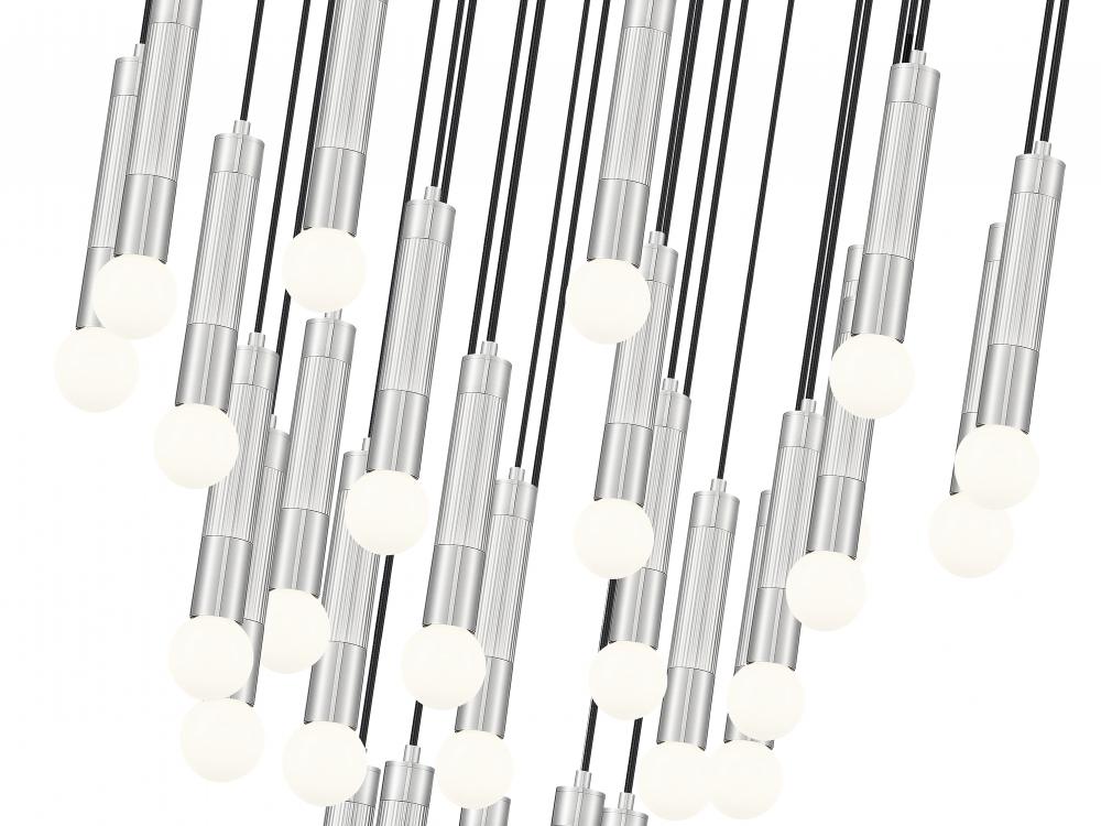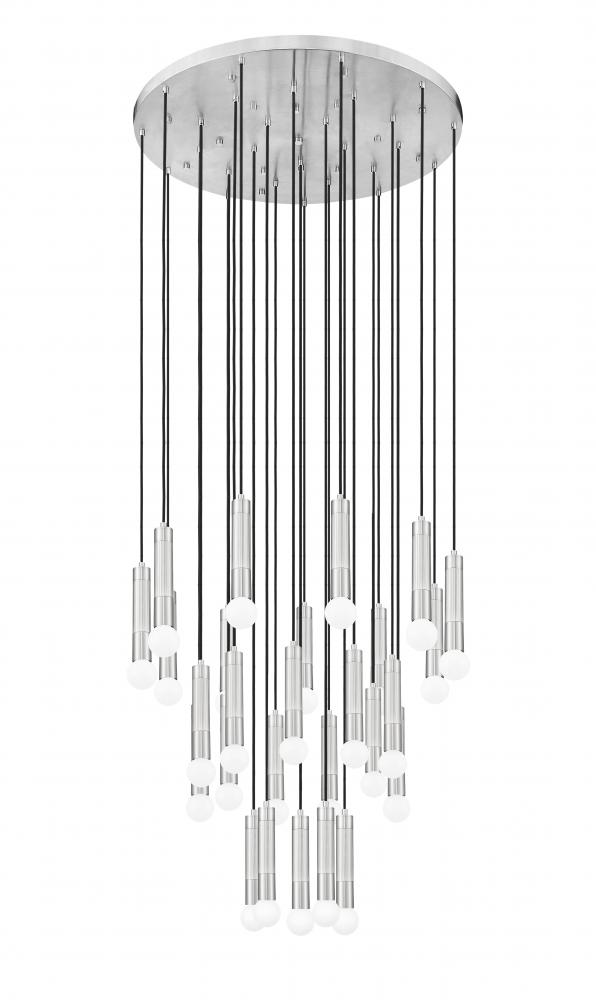 Capture the magic of modern simplicity with a striking 27-light round chandelier. Its a gorgeous display of elongated tubes and a brushed nickel finish, offering gleaming elegance over your living or dining room setting. Braided cord ensures an upgraded effect, delivering on a designer aesthetics in a refined home or commercial space.