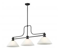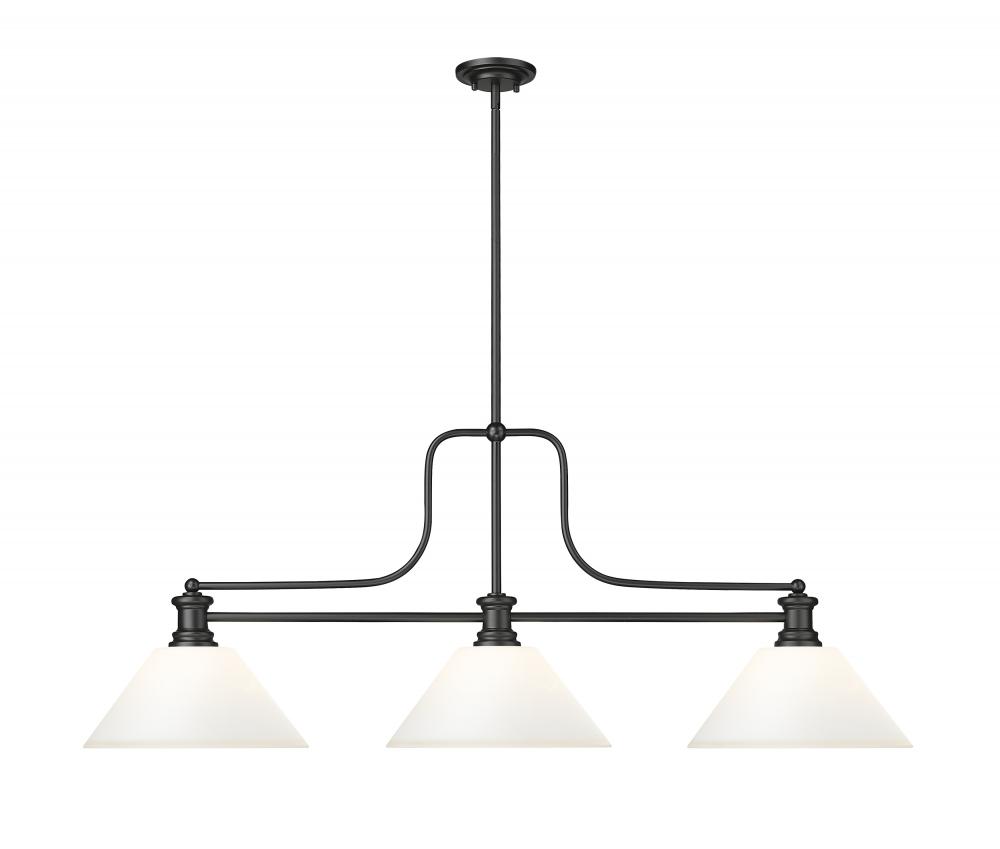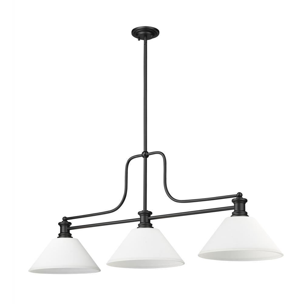 Smooth industrial vibes reflect an easy feel to the design of this stylish three-light billiards light from the M?lange collection by Z-Lite. A simple yet fluid silhouette blends matte black steel and matte opal glass shades forming a perfectly balanced profile. Choose this fixture for highlighting a kitchen island or sports room billiard space.