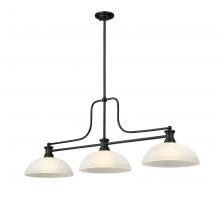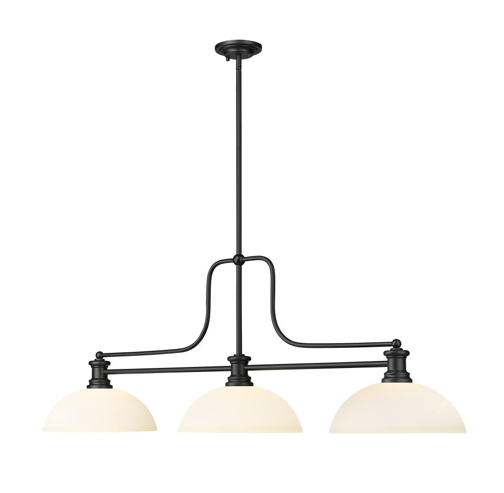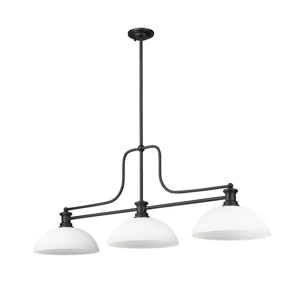 Signature details highlight the expert design and craftsmanship of a three-light linear billiards pendant. Matte opal glass dome shades cast a warm and welcoming glow over a kitchen island or game table, and offering a classic complement to matte black finish metal framing.