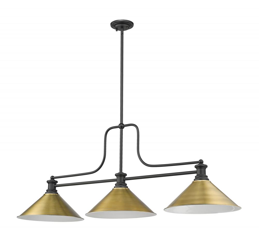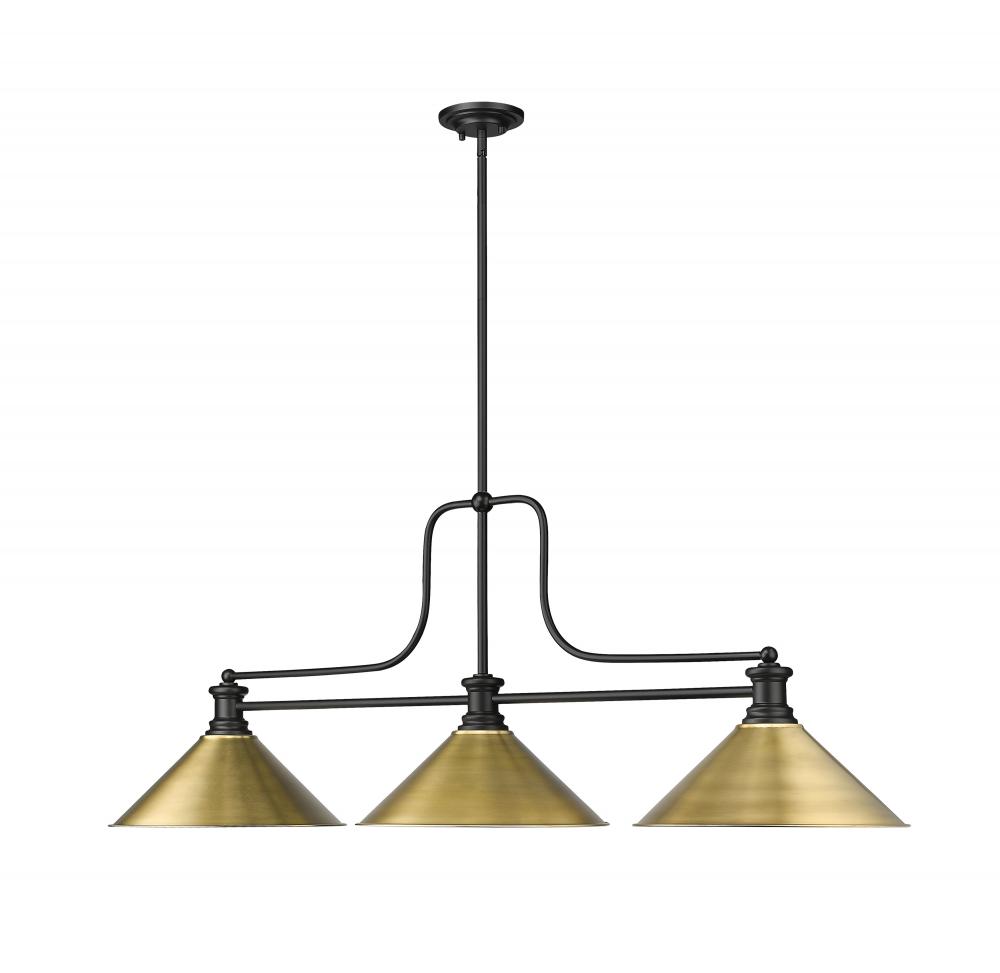 Signature details highlight the expert design and craftsmanship of a three-light linear billiards pendant from the M?lange collection. Rubbed Brass finish steel shades add industrial flair with a conical profile and clean edge, casting a warm and welcoming glow over a kitchen island or game table, and offering a classic monochromatic presentation.