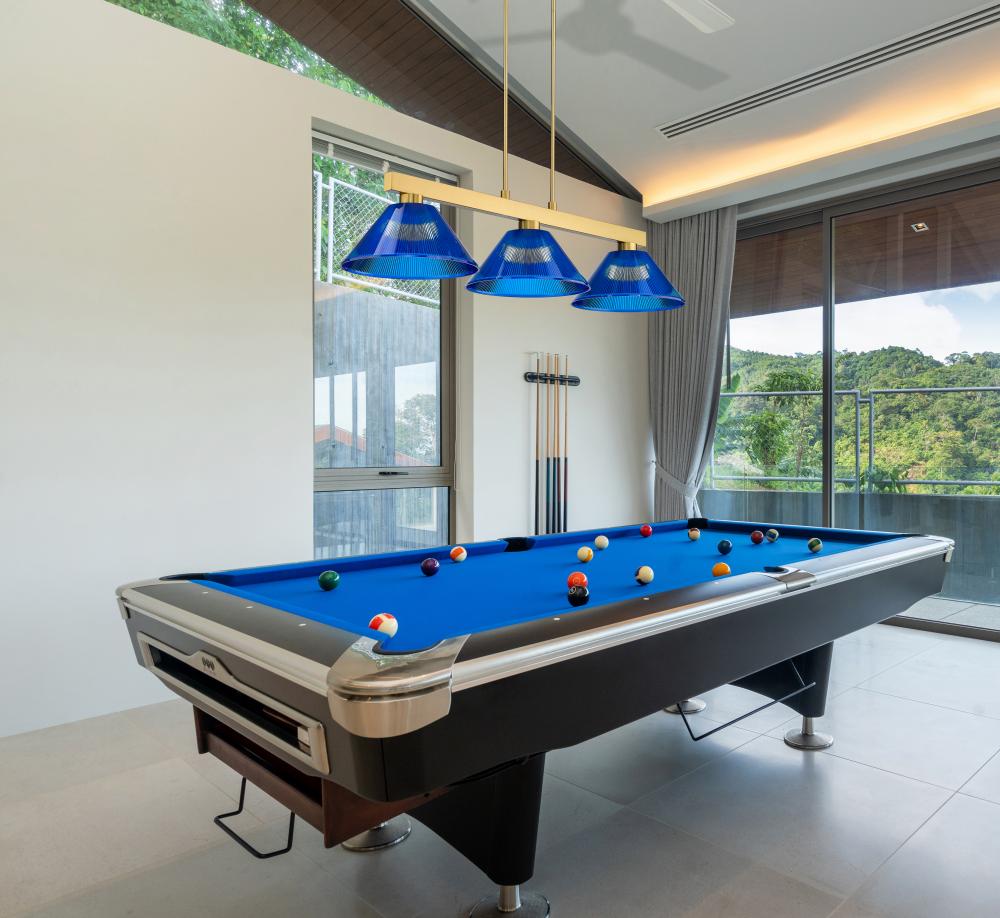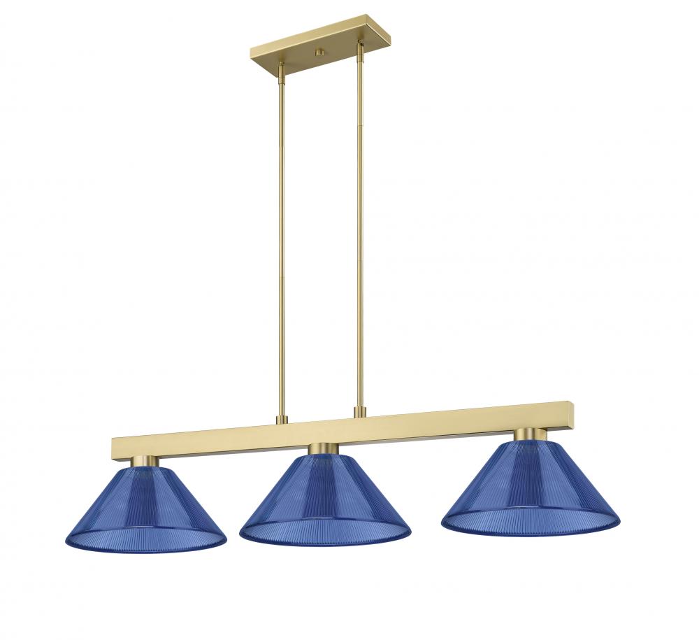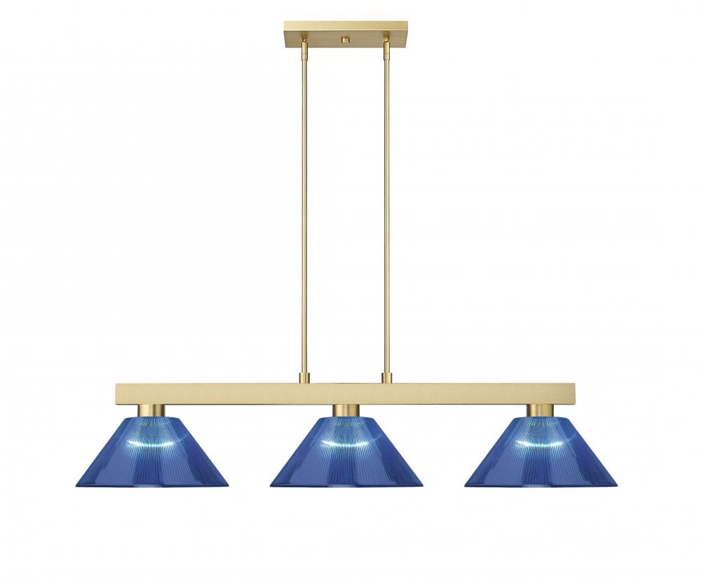Elevate your game play with a modern three-light billiard light from the Cobalt collection. Its suspension framework and vertical hanging bar receive a timeless modern gold finish thats warm and inviting, perfect for lounging with the family or entertaining friends. Three lights are shaded in plastic with a dark blue finish, offering soft, diffused illumination perfect for myriad games and activities.