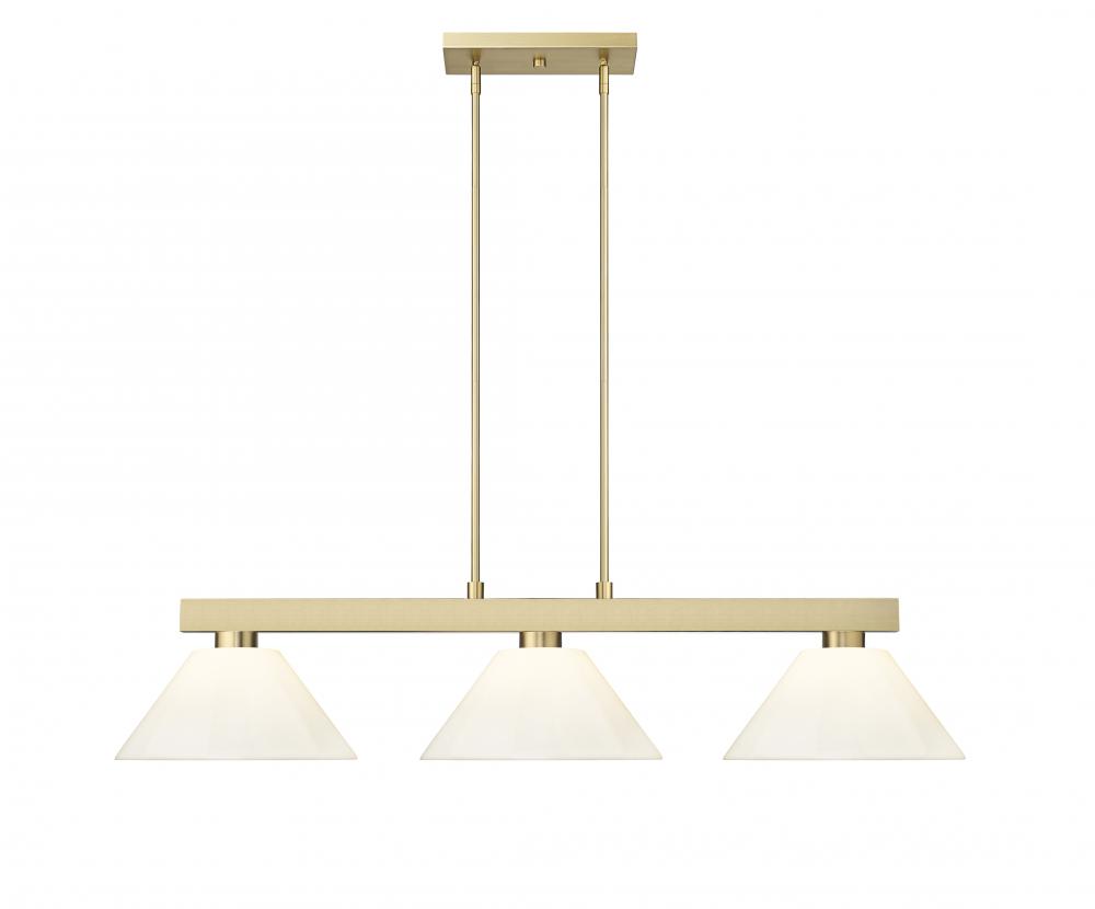 Conical shades bring classic ambiance to a modern three-light billiards light. Its clean-lined frame is perfect over a pool table or gaming space, featuring a modern gold finish that pairs perfectly with the crisp white of its shades. From the Cobalt collection, it offers bright illumination for all types of entertainment pursuits.
